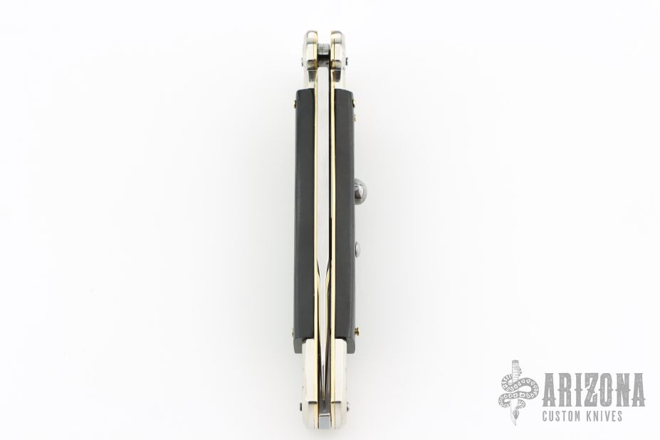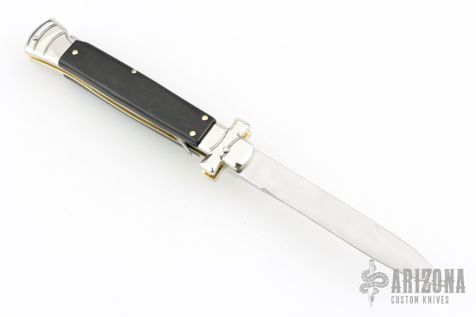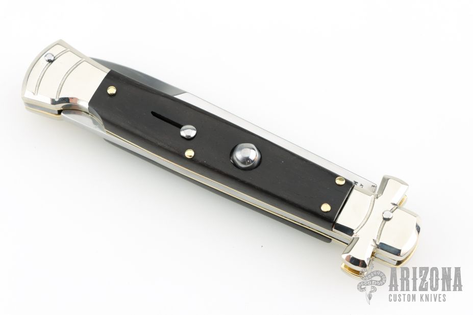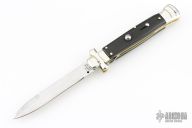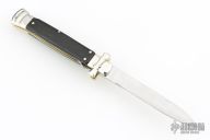 This lockback Auto by AGA Campolin has a stainless steel dagger blade with false top edge. Handle has ebony wood covers with nickel silver bolsters, brass liners, stainless steel backspacer. Comes with original box and leather slip sheath. This one was tuned and polished by Greg's Effects and has a COA. Excellent condition.