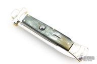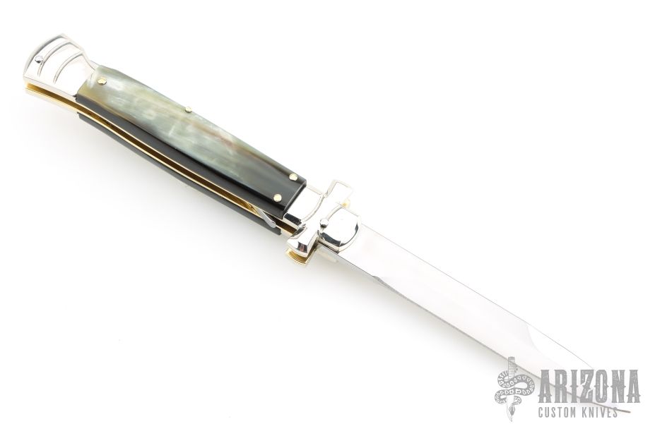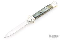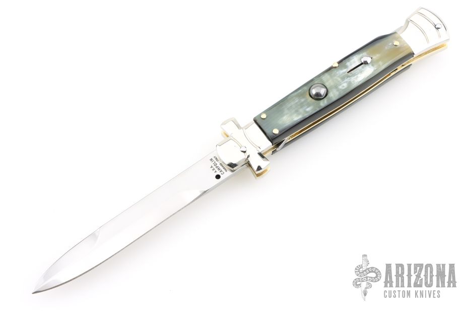 Angelo Campolin Sr. was born in 1923 in Maniago, Italy. He worked on perfecting his knife making skills before WWII and at this time made his first switchblades. After the war, in 1947 he started his company and made 30 stilettos with the marking “Angelo Campolin”. In the 1970’s Angelo’s son Gianni started to work in the company and they were specializing in folding hunting knives and also manual folding stilettos for the Robert Klaas company in Solingen Germany with their Kissing Cranes mark. In 2002 American switchblade collectors Dan Fuller, Brad West, and Tim Zinser were visiting Maniago and enjoying a few glasses of wine in a bar with Angelo Jr. and Gianni. The discussion was about a new name for some knife projects they wanted to pursue. It was Brad West that suggested the tang stamp should be AGA, for Angelo, Gianni, Angelo, thus representing three generations in the knife making business. The Campolins liked it and it stuck. In the beginning it was just a few items, but grew to the point where now there are 12 models and different scale options. The goal has been to offer quality switchblades using the old methods and traditions. Being a collector himself, Angelo Jr. knows what others like. The company headquarters has moved to Austria with production still in the original Maniago shop, as well as the others in Maniago that produce the knives for A.G.A. Campolin.
