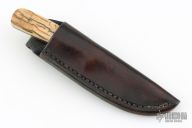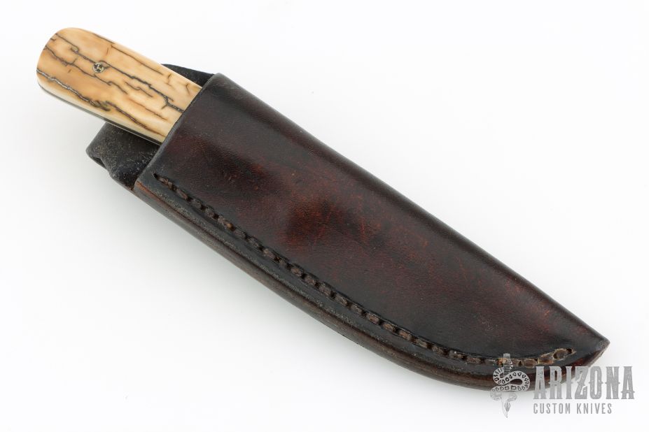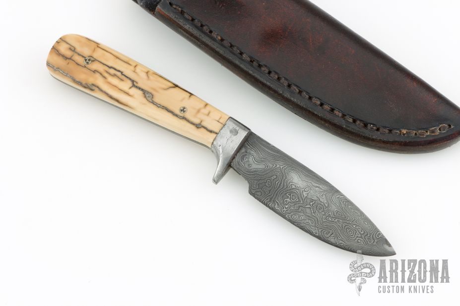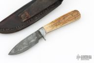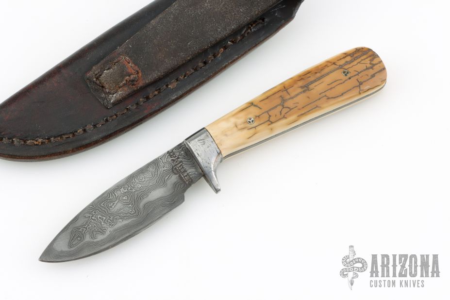 This Hunter by J.P. Miller features a Damascus blade with .132" blade stock and .977" blade, full tapered tang construction. The handle has a wrought iron guard, mammoth ivory scales with mosaic pins. Comes with a black leather sheath. Excellent condition.