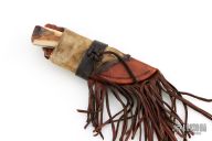 This Hunter by J.P. Miller features a Damascus blade with .140" blade stock and 1.200" blade, full tapered tang construction. The handle has a wrought iron guard, fossil walrus ivory scales with mosaic pins. Comes with a brown leather and rawhide sheath. Excellent condition.