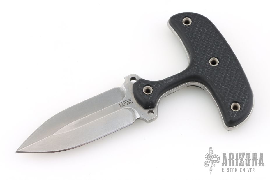 This push dagger by Busse features a stonewashed double edged blade with .188" blade stock and 1.175" blade depth, full tang construction. The handle has black G-10 scales. New from maker!