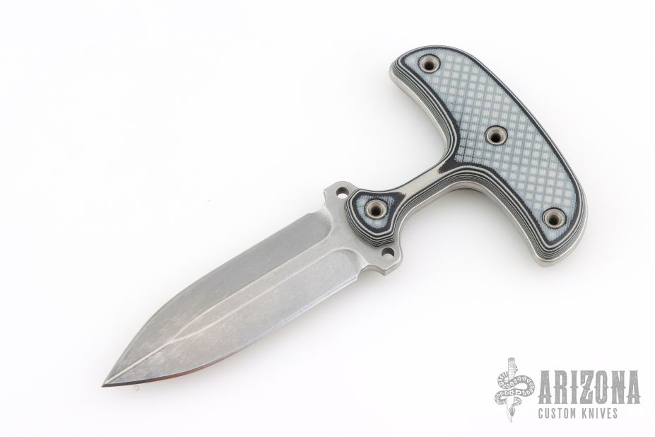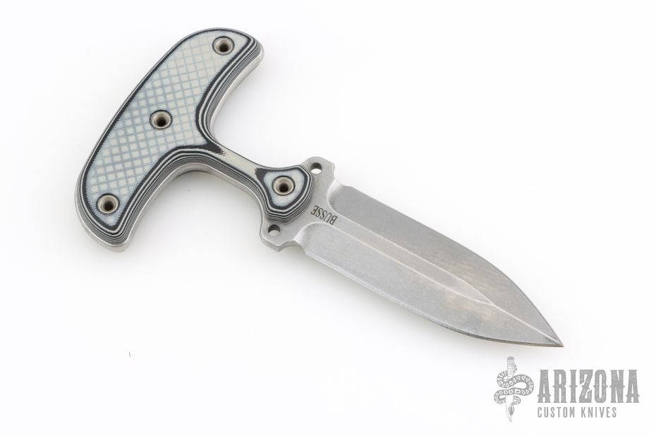 This push dagger by Busse features a stonewashed double edged blade with .188" blade stock and 1.161" blade depth, full tang construction. The handle has black/white G-10 scales. New from maker!