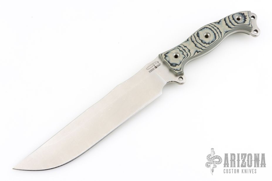This Nano Fusion Battle Mistress by Busse features a satin finished blade with .212" blade thickness and 1.780" blade depth, full tang construction. The handle has black/tan G-10 scales. New from maker!