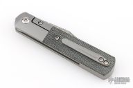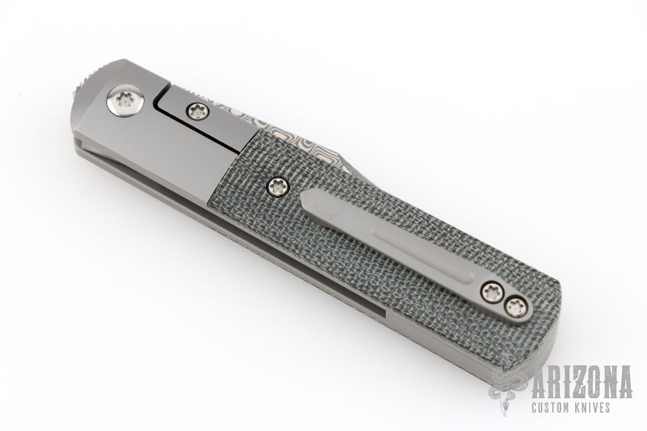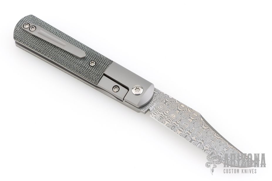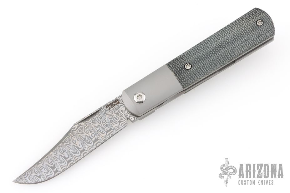 This Barlow Front Flipper by Enrique Pena features a Damasteel blade with a front flipper and notched thumbrest. The handle has titanium bolsters, black micarta scales, with a titanium backspacer and matching tip up pocket clip. Comes with original box. The box is marked "Barlow #1 Black Micarta". Excellent condition.
