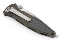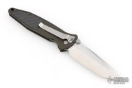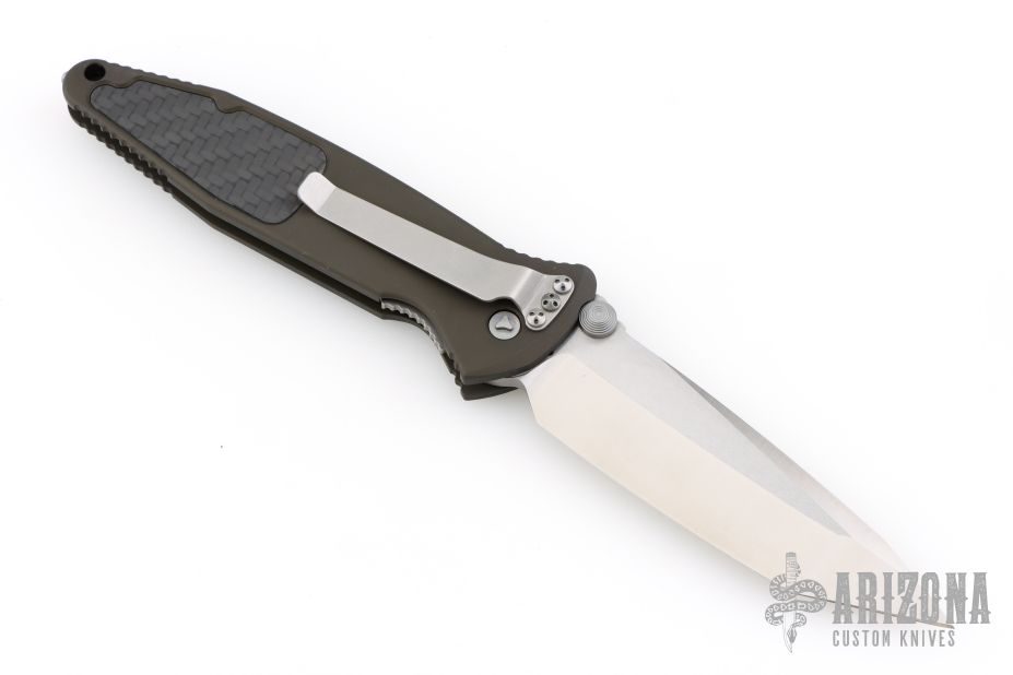 This Socom Elite from Microtech has a satin finished tanto blade with dual thumbstuds and notched thumbrest. The handle has a green aluminum frame with carbon fiber inserts and a tip down stainless steel clip. Dated 03/2012 and S/N 01349. Excellent condition. Comes with original box, papers and sheath.