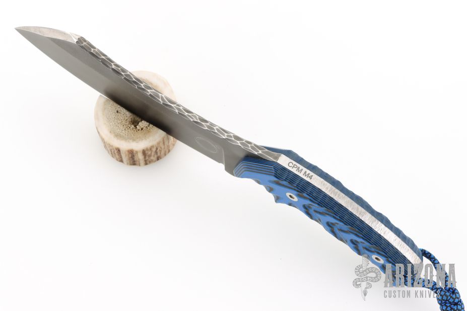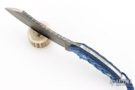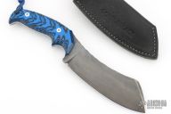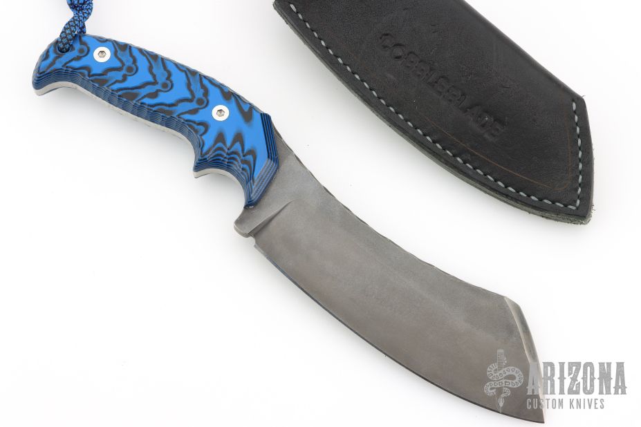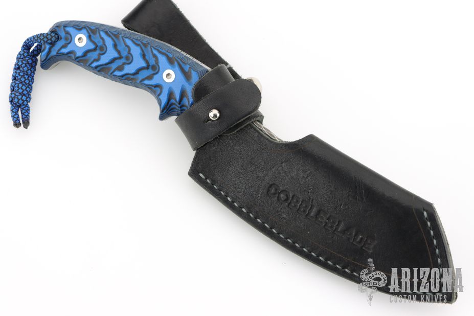 This Harpoon by Cobble Blade features a dark tumble finished blade with sharpened top edge and textured spine, .213" blade stock and 1.883" blade depth, full tang construction. The handle has textured black/blue G-10 scales, lanyard hole at the butt, textured tang. Comes with a black leather sheath with belt loop. Excellent condition.