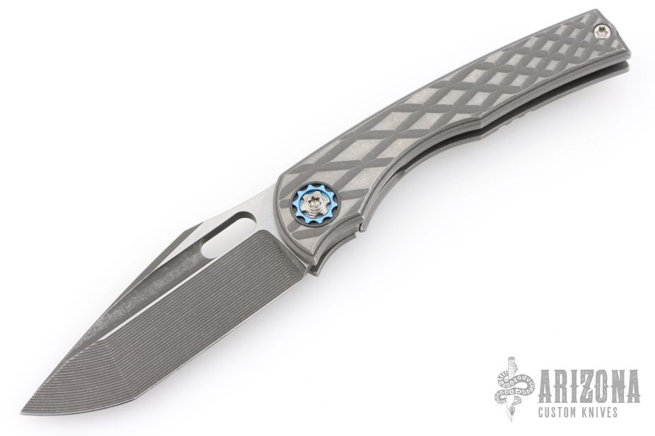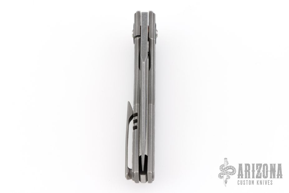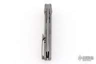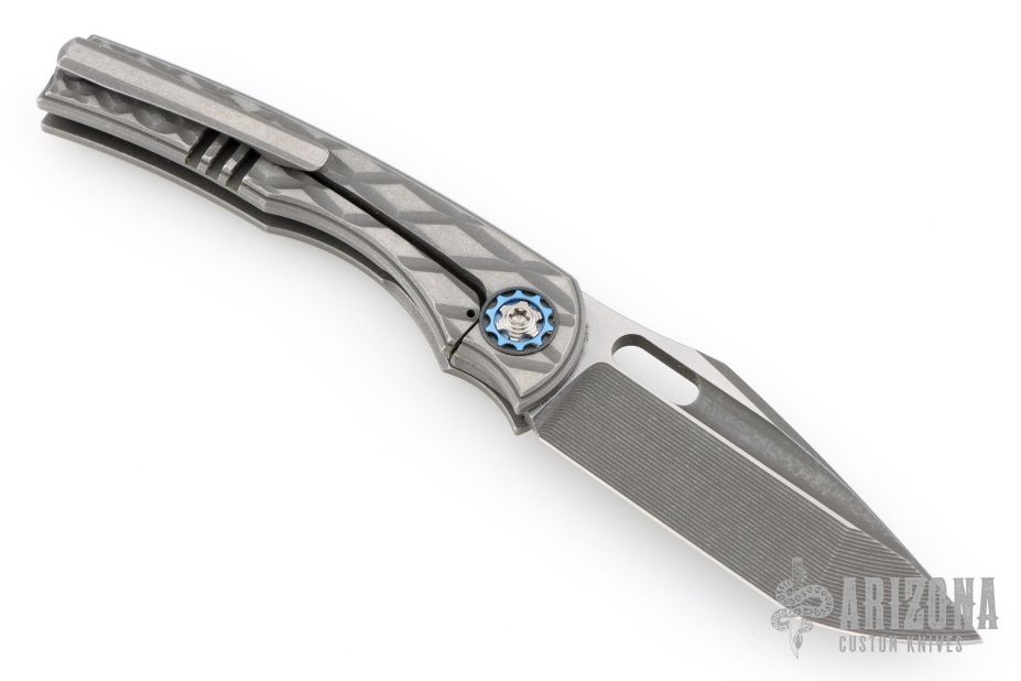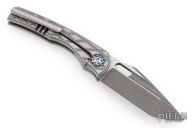 This BBM V2 by Nick Chuprin and Robert Carter features a two-tone acid wash finish blade with satin flats, fullers, thumbhole and milled bevels. The handle has a two tone factle milled titanium frame, Titanium hardware, and two tone anodized titanium backspacer. Two piece zirconium/titanium pivot and tip up clip with hidden screws. Nice detent, lockup and blade seating. Comes with a zippered case and COA. Excellent condition.