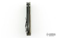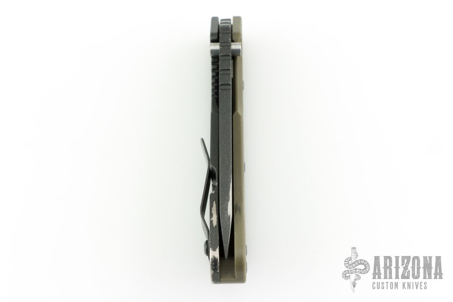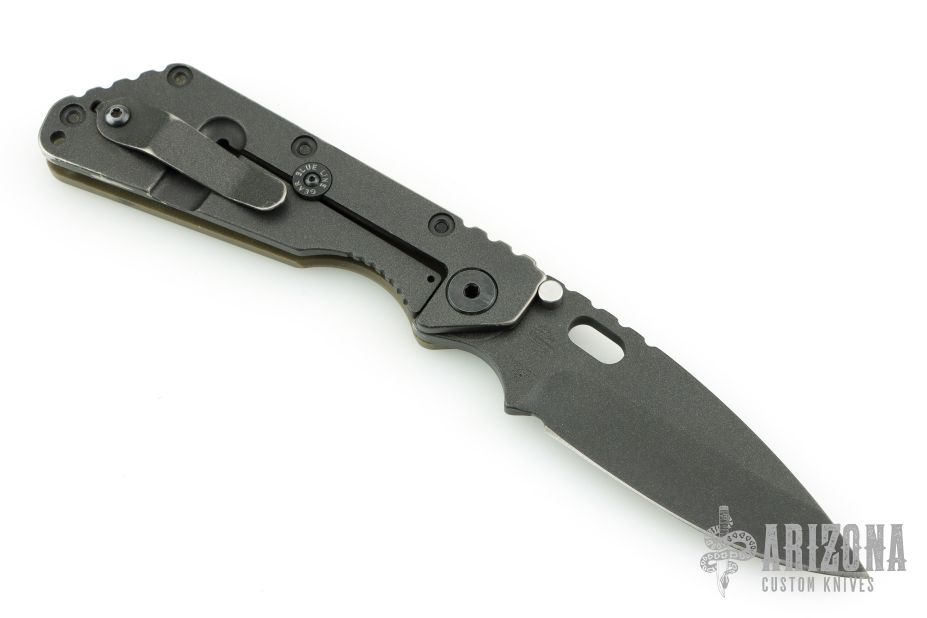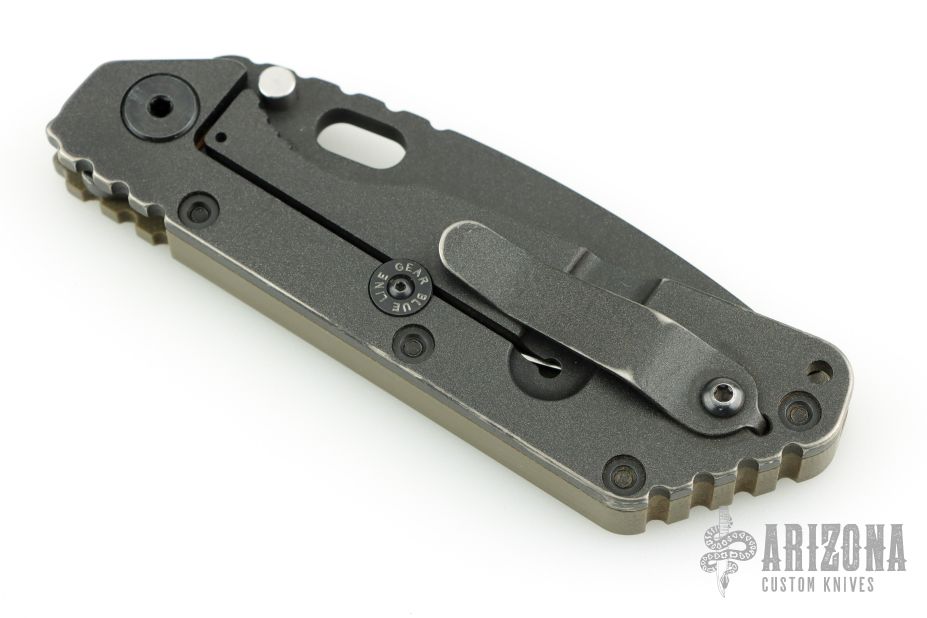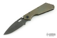 This SMF from Strider Knives features a black coated blade and textured green G-10 and black coated titanium handle and matching tip up titanium clip. Has lockbar stabilizer marked "Blue Line Gear". Notches on thumbrest, rear of handle, and lockup. Has a couple scratches, and some wear on the handle finish, otherwise good condition.