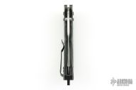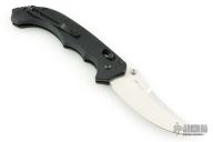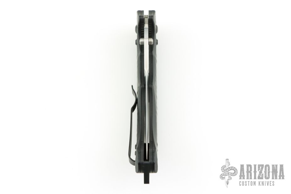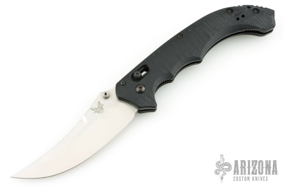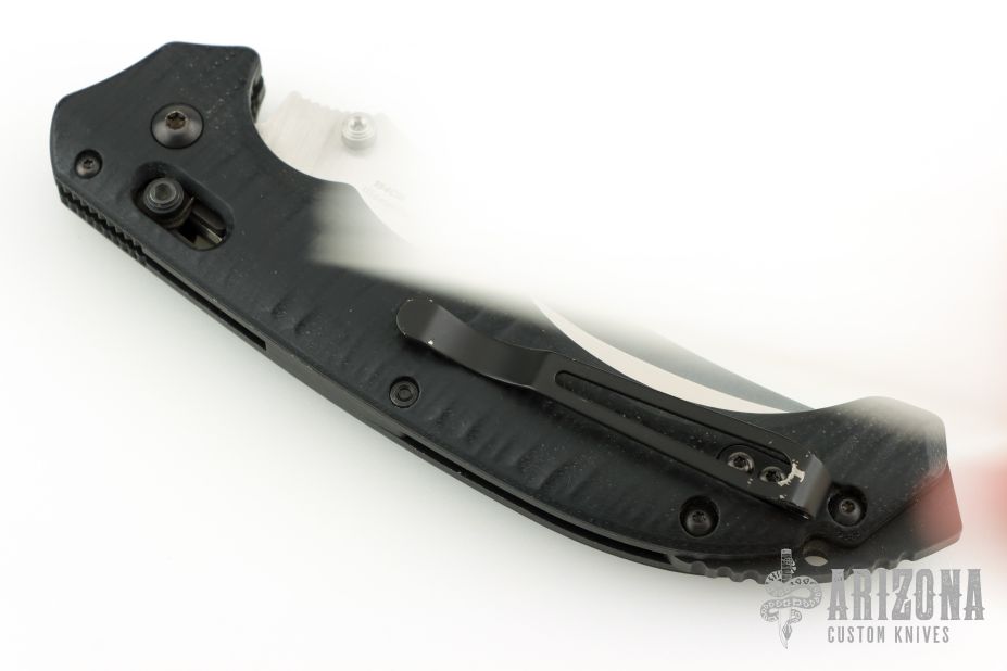 This 860 Bedlam from Benchmade features a satin finish trailing point blade with swedge, dual thumb studs and notched thumb rest. The handle is comprised of textured black G10 scales over black coated steel liners and steel backspacer with lanyard hole and glass breaker. Black coated tip up pocket clip can be mounted for right or left hand carry. The pocket clip shows some wear otherwise the knife is in excellent condition.