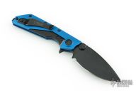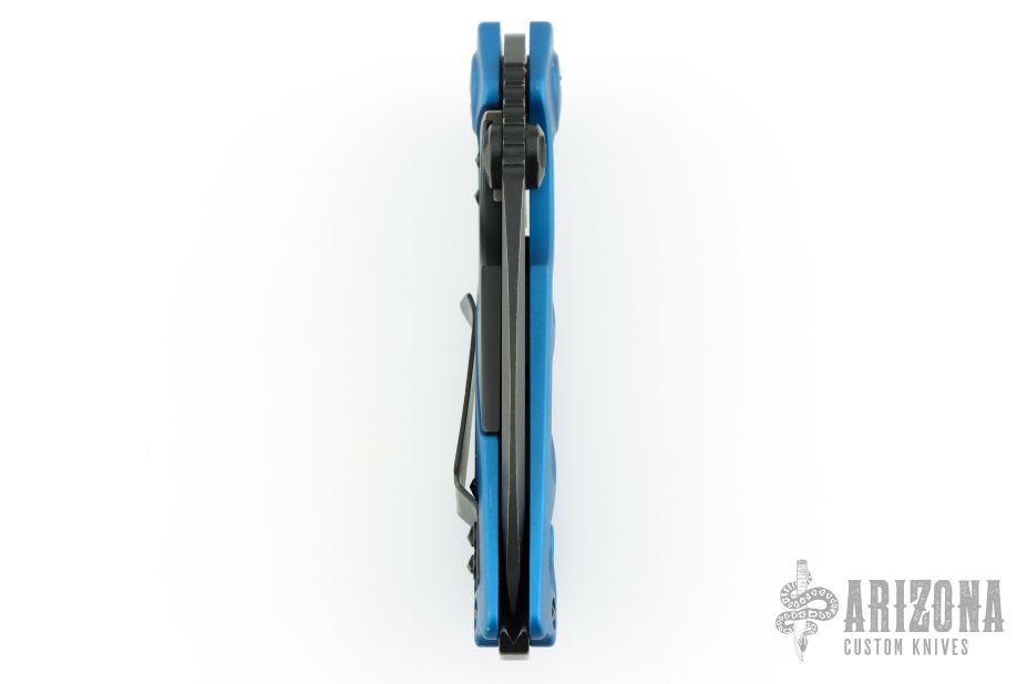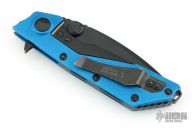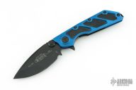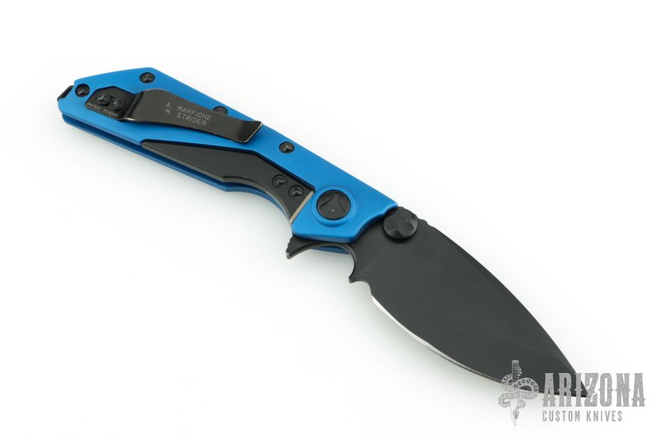 This DOC Framelock Flipper is a collaboration between A. Marfione and M. Strider, their names are on the clip. The blade is black with dual thumb-studs, flipper and a notched thumbrest. The handle is blue aluminum with non-slip inserts, and a blasted stainless steel clip, tip up carry, blasted hardware. Dated 07/2015 and serial number 4361. Has some scuffs and wear on the finished, otherwise good condition.