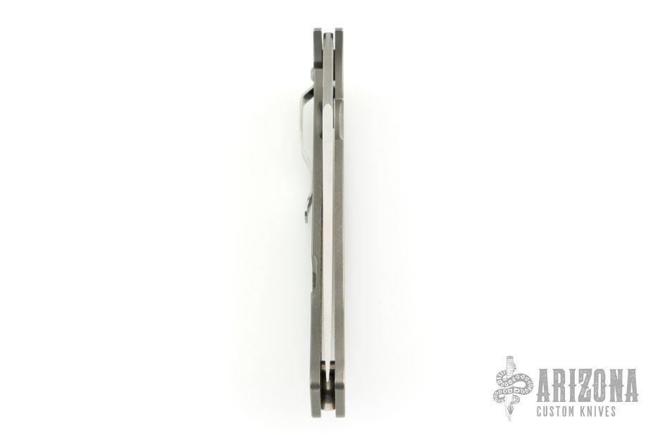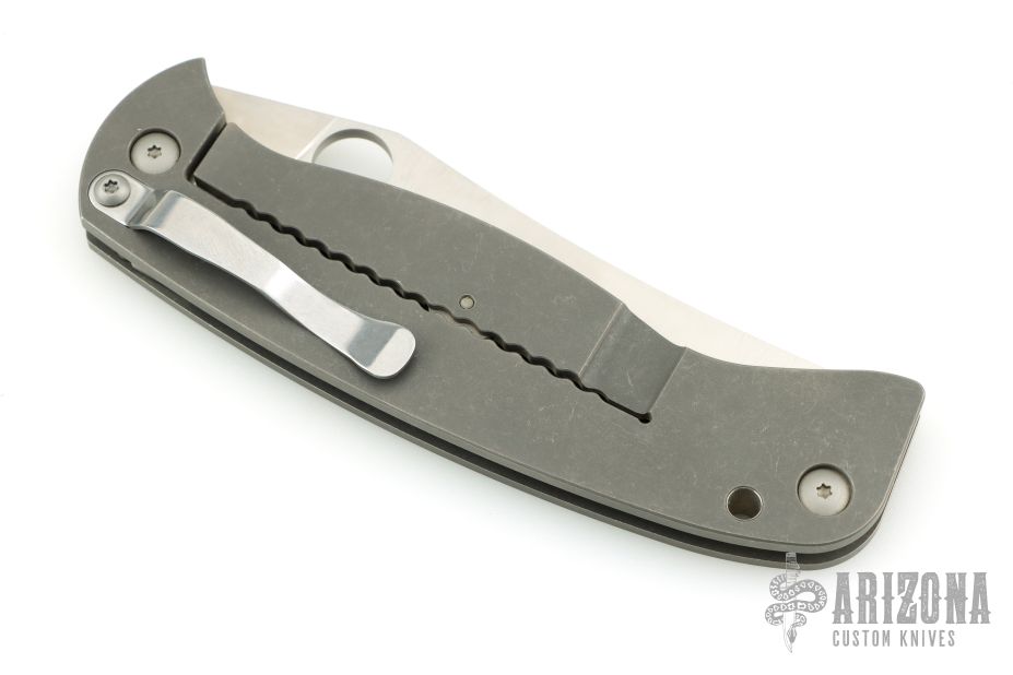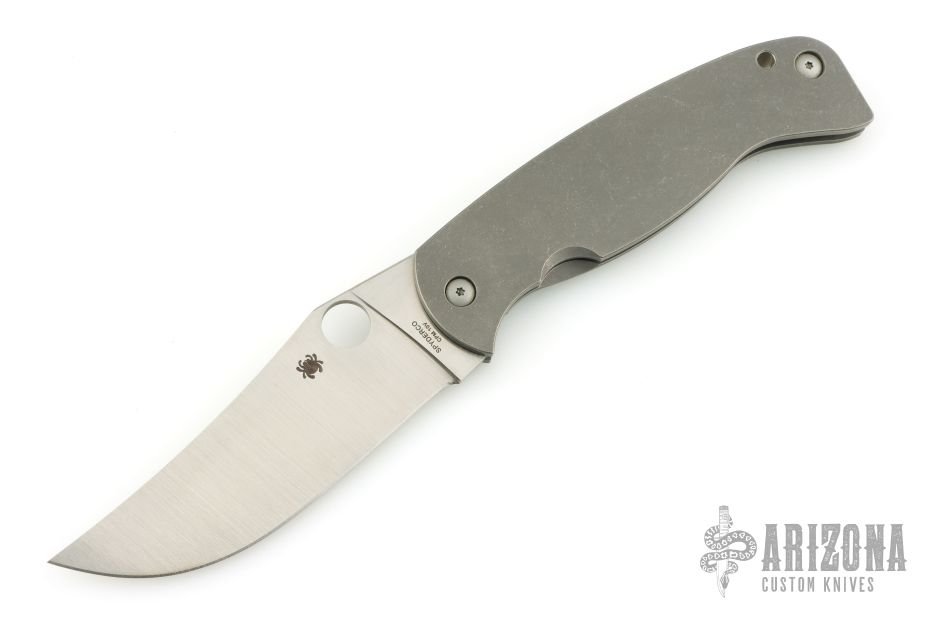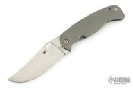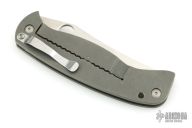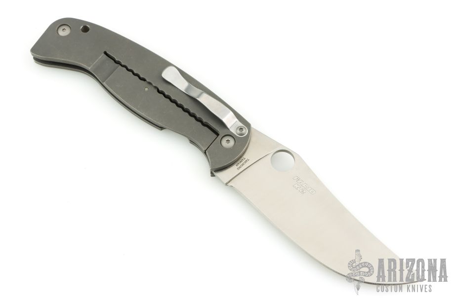 This K-2 Folder by Spyderco is a Farid Design, it features a satin finished clip point CPM 10V blade with thumbhole. The handle has a tumble finished titanium frame with a tip down stainless steel clip, lanyard hole at the butt. Nice detent, lockup and blade seating. Excellent condition.