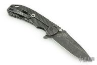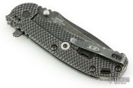This 0560BW Framelock Flipper (#0148) has a blackwashed Elmax drop/ spear point blade with dual thumb studs and notched thumb rest. Handle is 3-D machined black G10 over stainless steel single liner, and 3-D machined blackwashed titanium (lock side). Black stainless steel 4-way reversible clip. Lanyard hole at butt. Has some light scuffs, otherwise excellent condition.