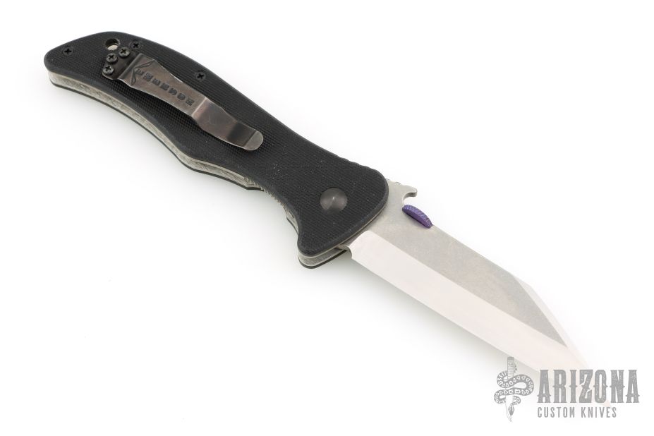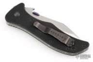 This Seax by Emerson Knives features a stonewash wharncliffe blade with thumbdisc, notched thumbrest and wave feature. The handle has textured black G-10 scales, titanium liners, black tip up stainless steel clip. Has a couple light scratches on the clip, otherwise excellent condition. Comes with original box and papers. #1241