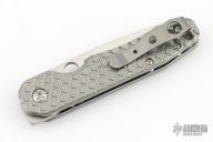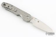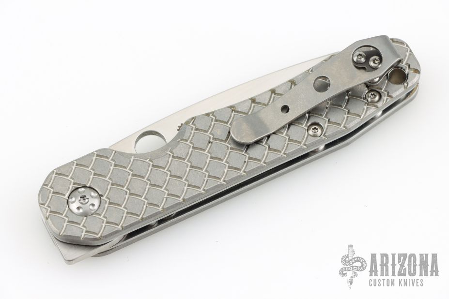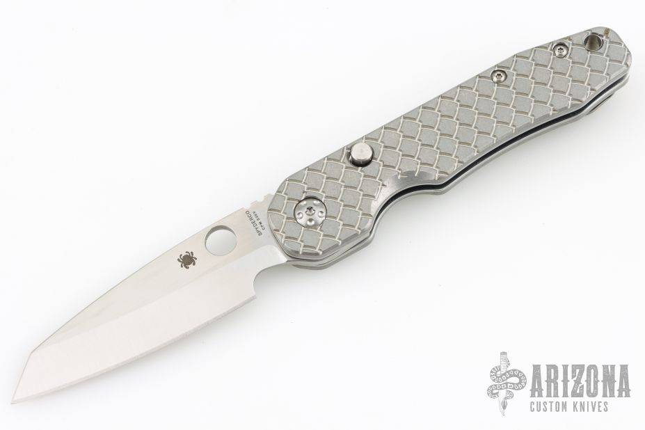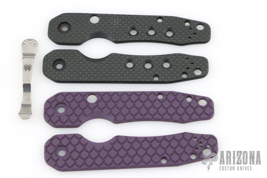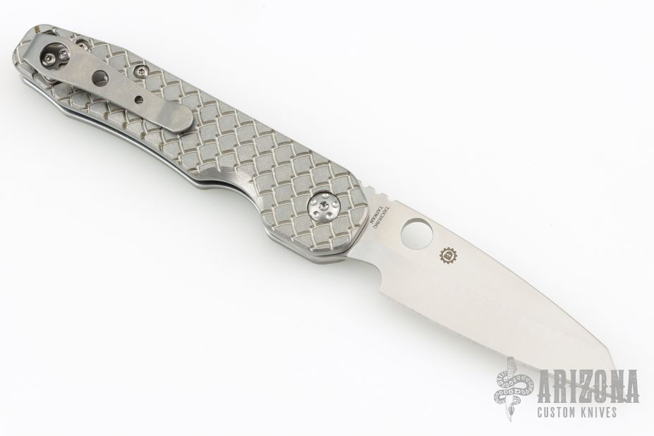 This Smock by Spyderco has a satin finish sheepsfoot style blade. The handle features titanium scales over stainless steel liners with a titanium deep carry pocket tip up pocket clip. Comes with original box and papers. Listing includes original scales, and clip, as well as a set of purple g10 covers. Excellent condition.