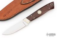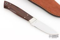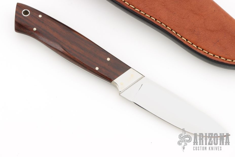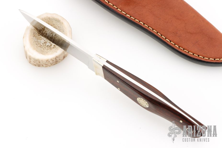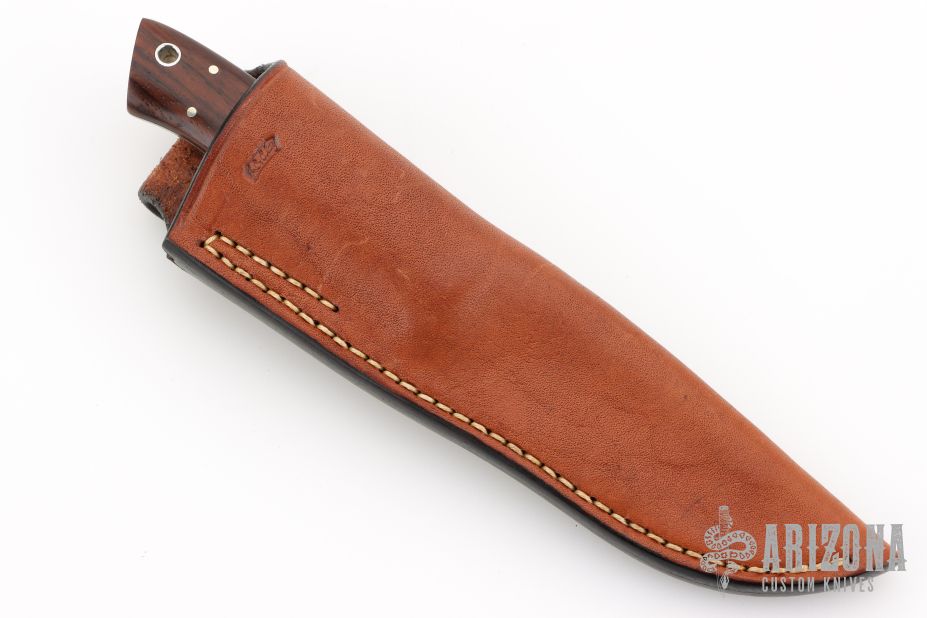 This knife by JD Clay features a mirror finished blade with .131" blade stock and .931" blade depth, full tapered tang construction. The handle has cocobolo scales with nickel silver pins and bolsters. Comes with a brown leather sheath. Has some light scratches, otherwise excellent condition. Sheath is stamped 06-0311