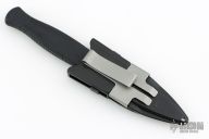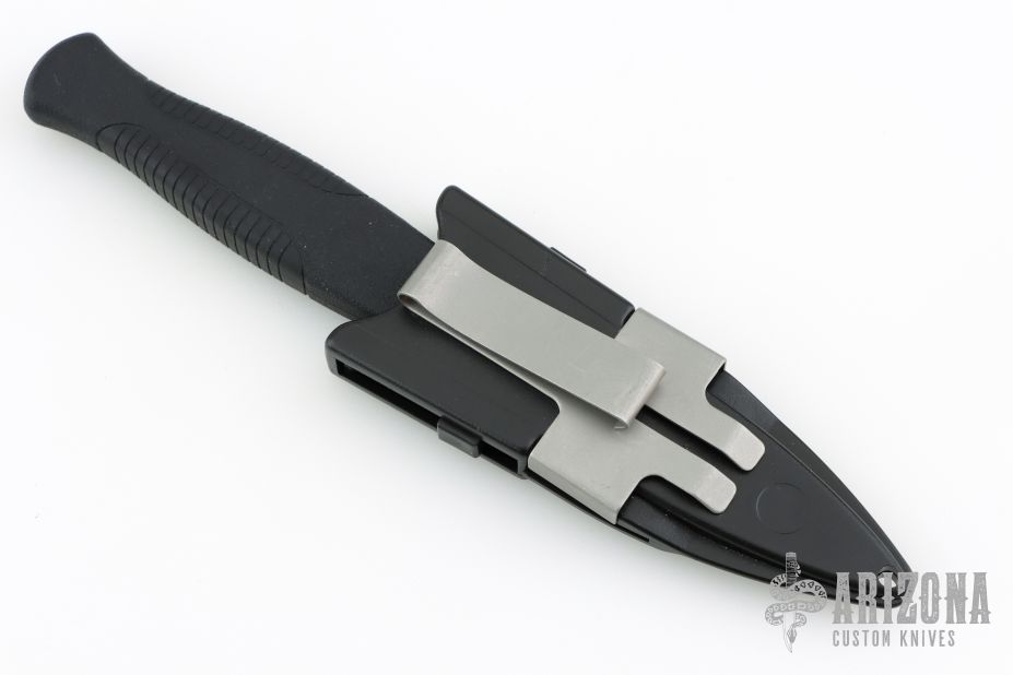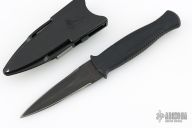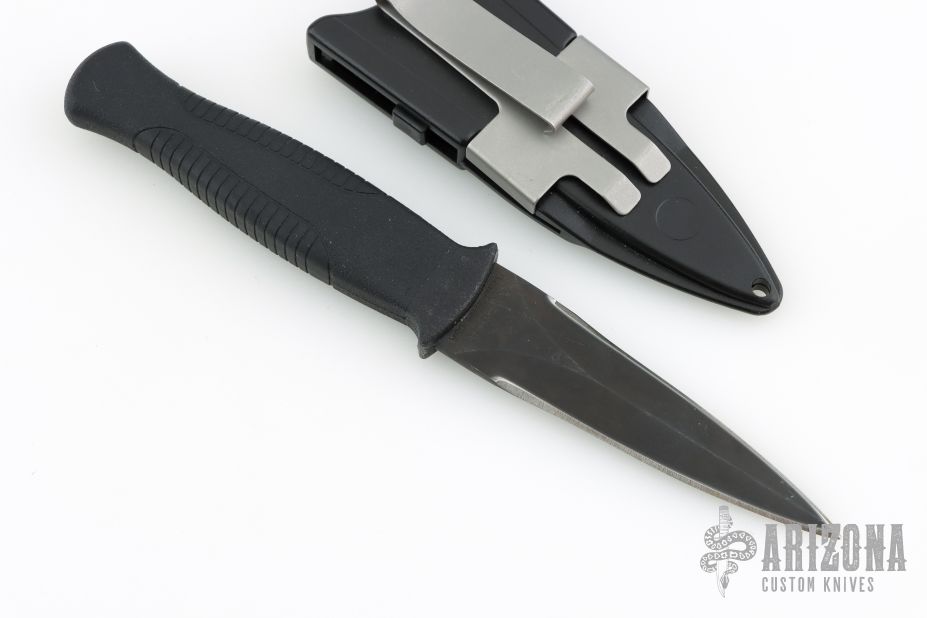 This Guardian by Gerber features a double edged black blade with a hidden tang construction. The handle is black rubber. Includes a black sheath. Has a couple light scuffs, otherwise excellent condition.