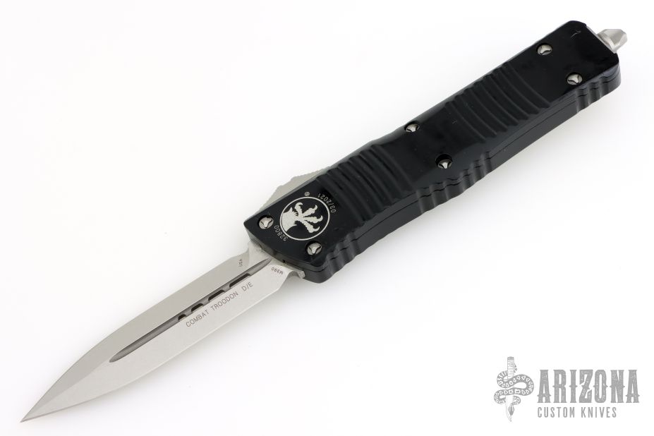 This Combat Troodon OTF automatic features a stonewash blade with a standard edge. Black aluminum handle with a tip down blasted stainless steel clip. Glass breaker. Serial number 32800and dated 03/2021. Comes with original box and papers. Excellent condition.