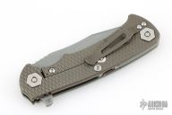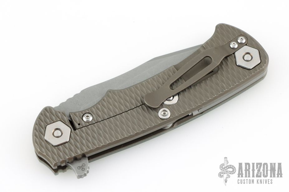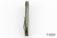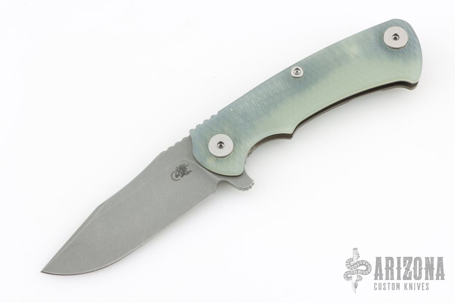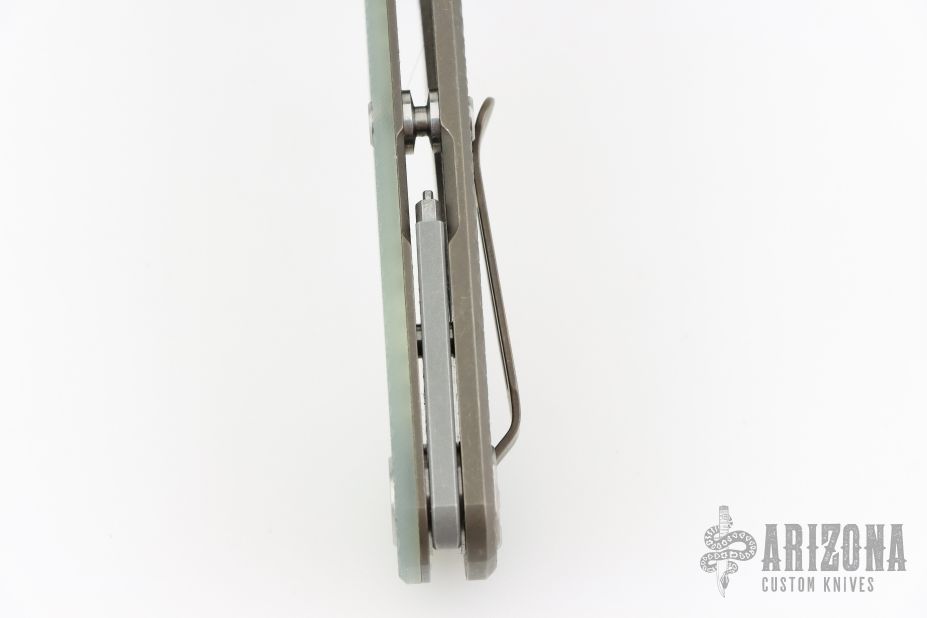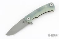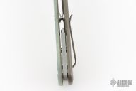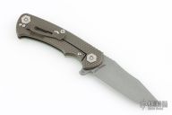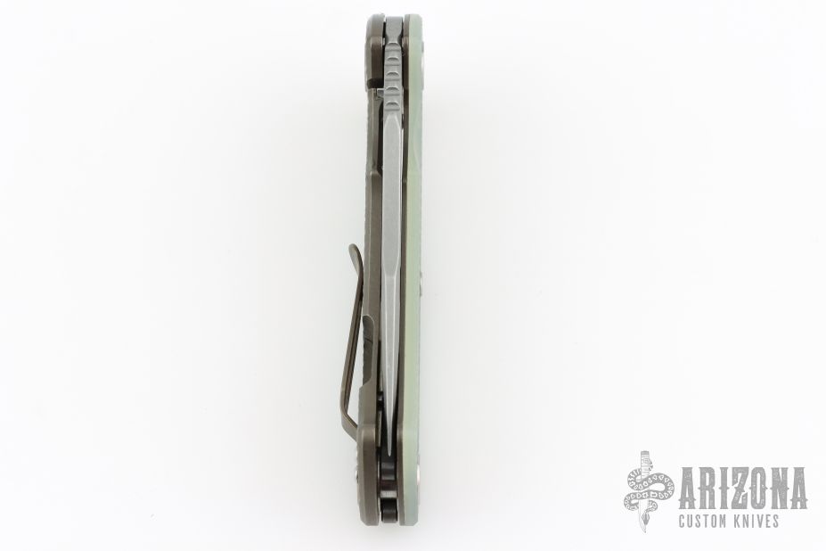 This Project X Flipper by Rick Hinderer Knives features a stonewashed blade, notched thumbrest and flipper, dual thumbstuds. The handle has a jade g10 cover, bronze textured titanium frame, and matching clip. Nice lockup, seating, and detent. Comes with original box, card, and extra washers. Excellent condition.