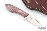 This TK-1 Wharnie by Tom Krein features a satin finished blade with .097" blade stock and .722" blade depth, full tang construction. The handle has giraffe bone scales with black liners, mosaic pin and aluminum lanyard tube. Includes brown leather sheath. Has a couple very light scratches, otherwise excellent condition. Dated 2018