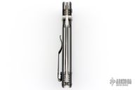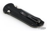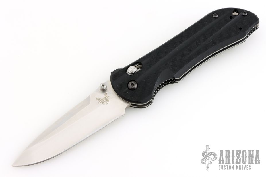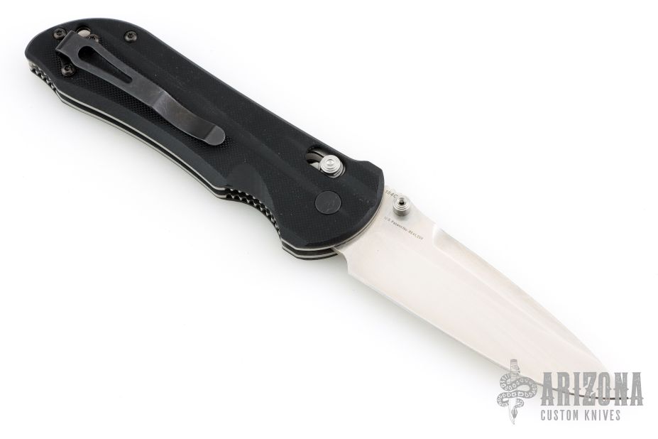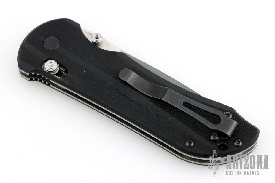 This Stryker by Benchmade features a stonewash finish drop point blade with a plain edge. The handle has black G-10 scales, an axis lock and stainless steel liners with a tip up black stainless steel clip. Nice lockup and blade seating. Excellent condition. Comes with original box.