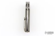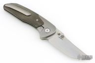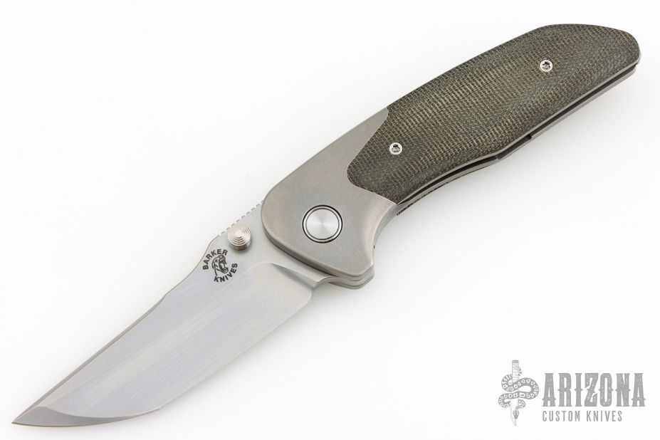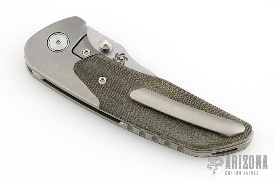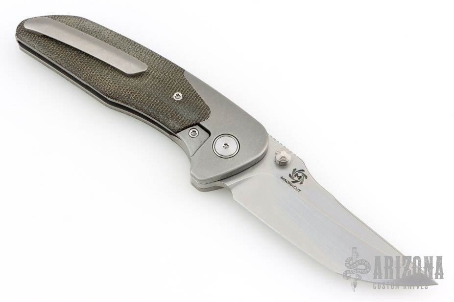 This Hokkaido by Mechforce features a stonewash finished tanto blade with notched thumbrest and flipper. The handle has a stonewash finished titanium frame with OD Green canvas micarta scales, titanium tip up clip with hidden screws and a backspacer with lanyard pin. Rides on bearings, nice detent, lockup and blade seating. Comes with original box and hard case. New from maker!