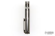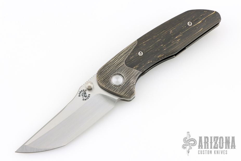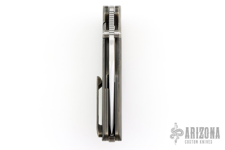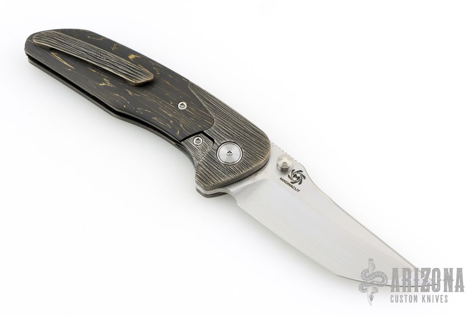 This Hokkaido by Mechforce features a hand rub satin finished tanto blade with notched thumbrest and flipper. The handle has a bark finished titanium frame with brass infused carbon fiber scales, titanium tip up clip with hidden screws and a backspacer with lanyard pin. Rides on bearings, nice detent, lockup and blade seating. Comes with original box and hard case. New from maker!
