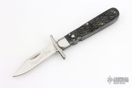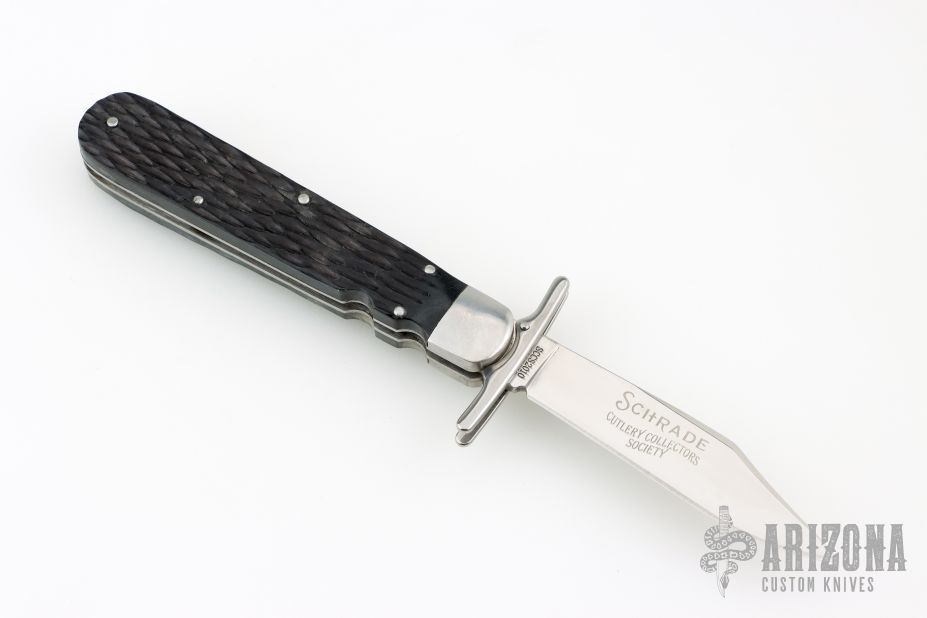 SCHRADE CUT CO SCC2010 Collector Society Giveaway Hunter's Pride copy knife NIB. This is a manual folding copy of the Schrade Cut Co Hunter's Pride knife that was made in 2010 as a Welcome Gift when you joined the Schrade Collector's Society. This knife is New in the original box and measures 4 7/8" closed and 8 5/8" open and it has steel liners, bolsters, guards & button. The clip blade is full and engraved EVERLASTINGLY SHARP on the face and the tang is stamped SCHRADE CUT CO. The back of the blade is engraved SCHRADE CUTLERY COLLECTORS SOCIETY and the back tang is stamped SCCS2010. You have to press the button to release the blade to be opened manually and also press the button in order to release the blade to be closed. These knives tend to be very Stiff and a little hard to open at first, but they should loosen up with a little oil and time. Made in China.