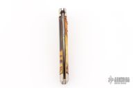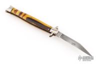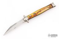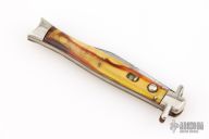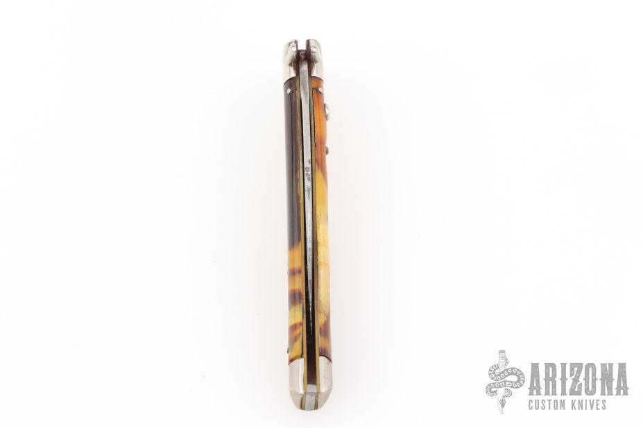 This antique auto by Schrade features a satin finished clip point blade. The handle has nickel silver bolsters, acrylic scales, brass liners and steel backspacer, has safety. Nice action and blade seating. Has some light scratches and patina, has some blade play, otherwise good condition for its age.