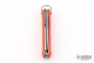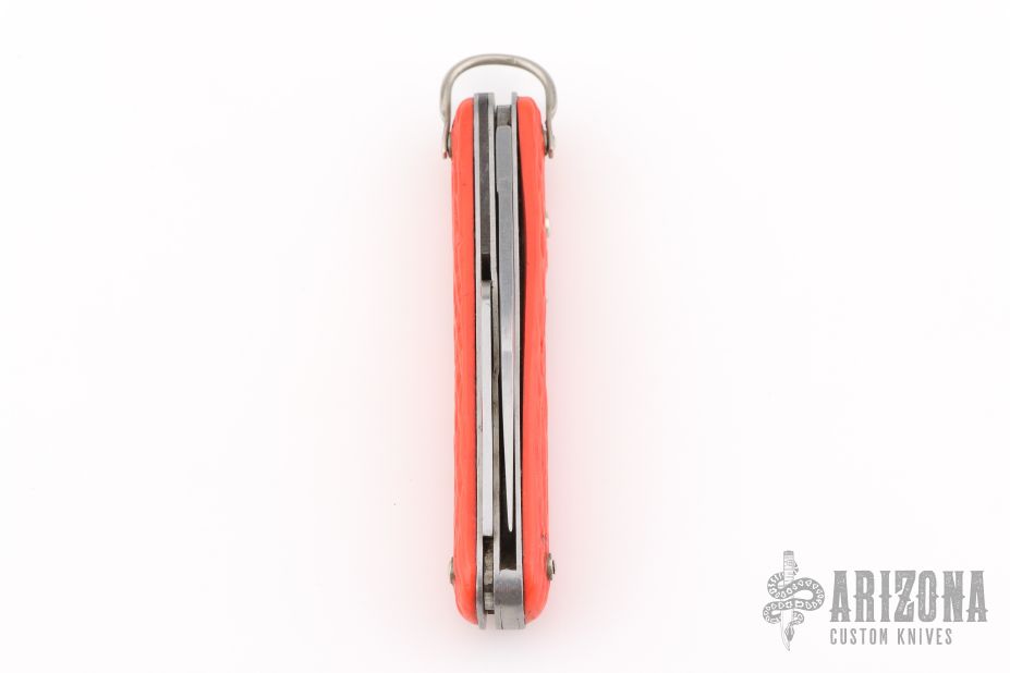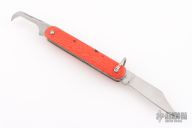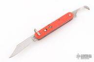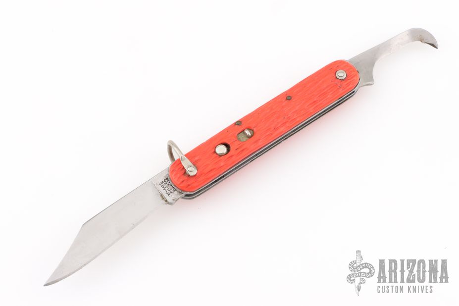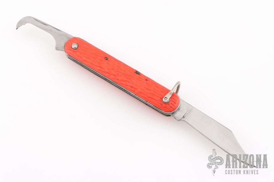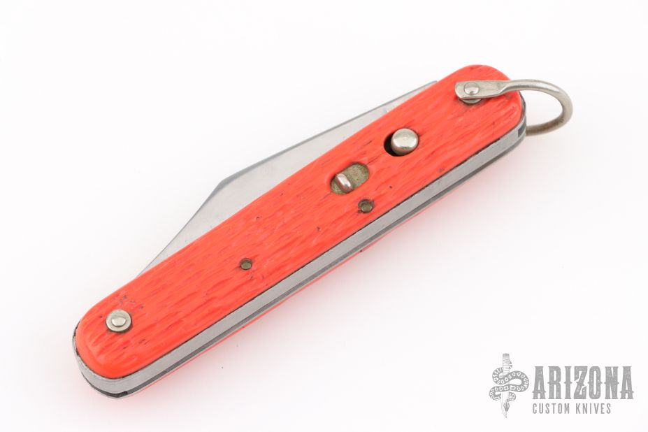 This knife by Schrade features a clip point blade. The handle has orange jigged scales, stainless steel liners and backspacer. Has Safety.  Has some blade play, scratches, has been sharpened, otherwise the knife is in good condition for its age.