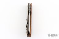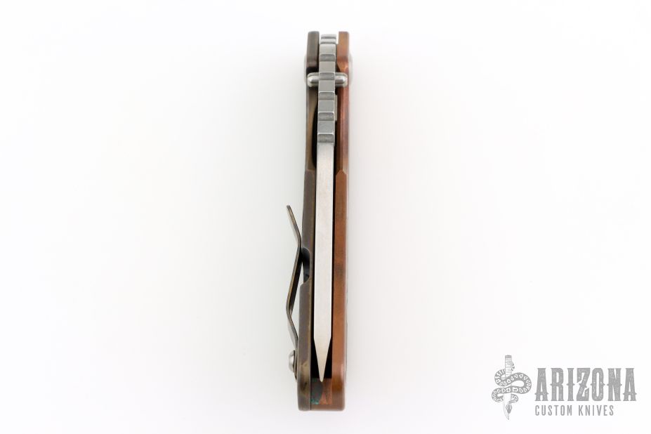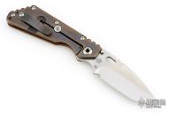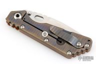 This Mick Strider SMF framelock folder features a satin finished tanto blade with thumbhole and notched thumbrest. The handle has a copper and a tiger striped finished anodized titanium frame with titanium clip, tip up carry. Jimping on blade spine. Includes Hinderer "Lock Bar Stabilizer" for maximum reverse lock retention. Nice detent, lockup and blade seating. New from maker!