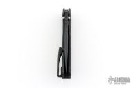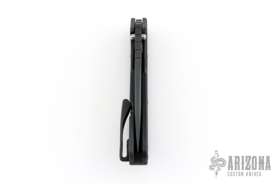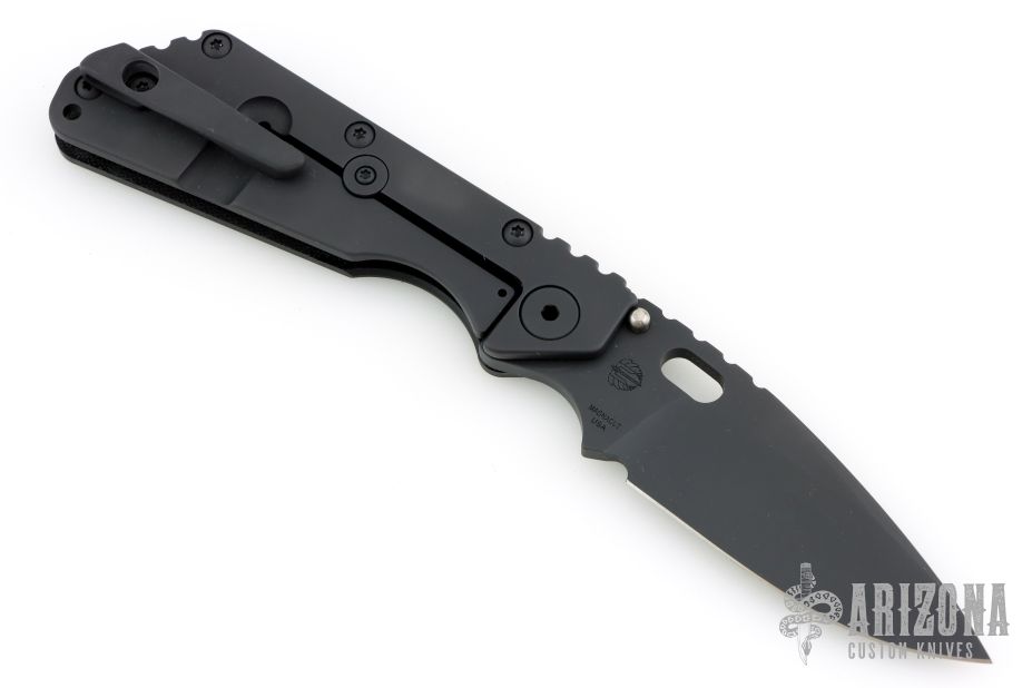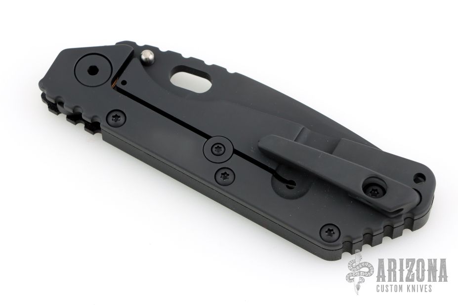 This SMF from Strider Knives features a tiger stripe blade and textured black G-10 and black titanium handle and matching tip up Lynch NY titanium clip. Notches on thumbrest, rear of handle, and lockup. Includes Hinderer "Lock Bar Stabilizer" for maximum reverse lock retention. Comes in a Dragon Cut Strider pouch and original clip. Excellent condition.