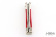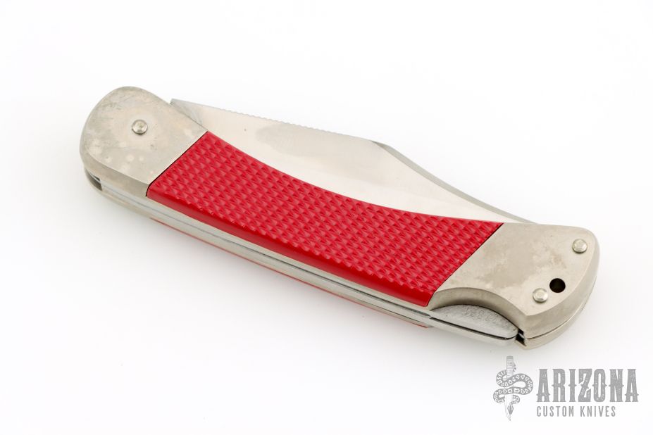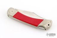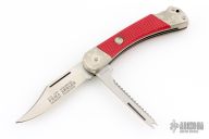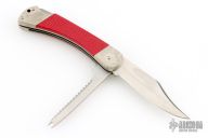 This Angler by Puma Knives features a satin finished clip point blade with partially serrated top edge and nail nick, the other blade with a scaler with nail nick. It has a nickel silver frame with red insets, lanyard hole at the butt. #22881. Has some patina, otherwise excellent condition.