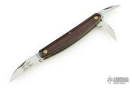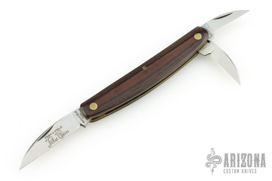 This Farm and Field Pocket Carver features three satin finished blades all with nail nicks. The handle has micarta covers, over brass liners and a steel backspring. Comes with original tube and wax paper. Excellent condition.