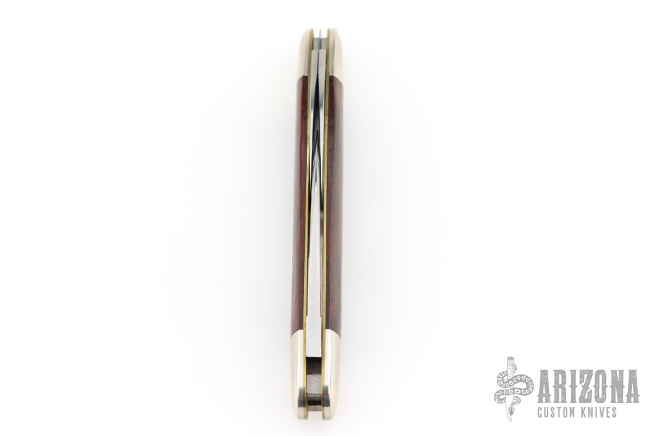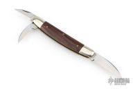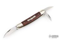 This Farm and Field Pocket Carver features three satin finished blades all with nail nicks. The handle has wood covers, over brass liners and a steel backspring. Comes with original tube, button, and wax paper. Excellent condition.