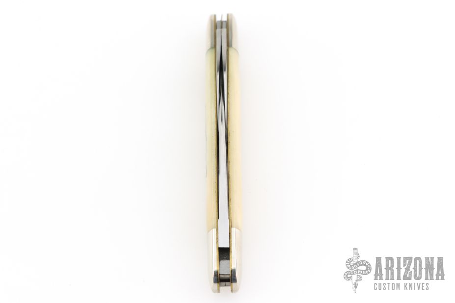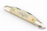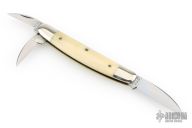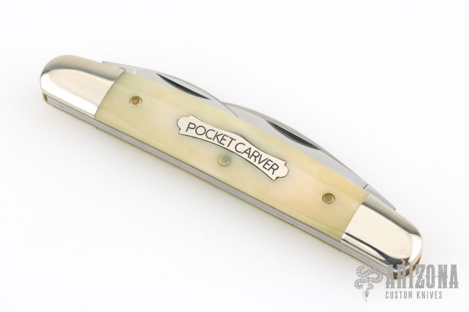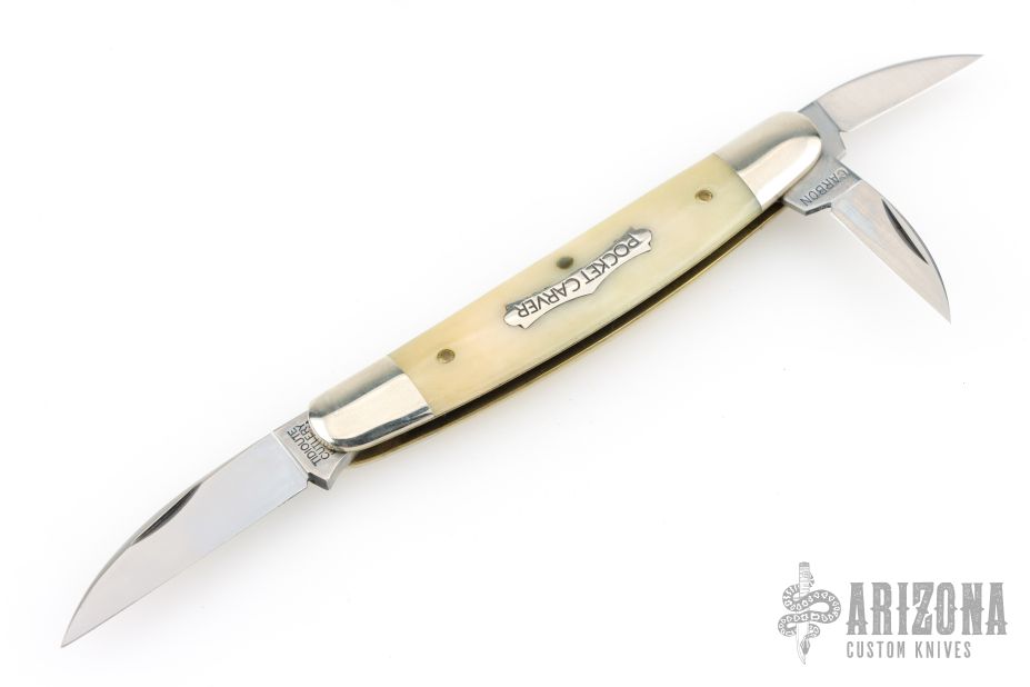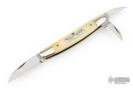 This Farm and Field Pocket Carver features three satin finished blades all with nail nicks. The handle has bone covers, over brass liners and a steel backspring. Comes with original tube, button, and wax paper. Excellent condition.
