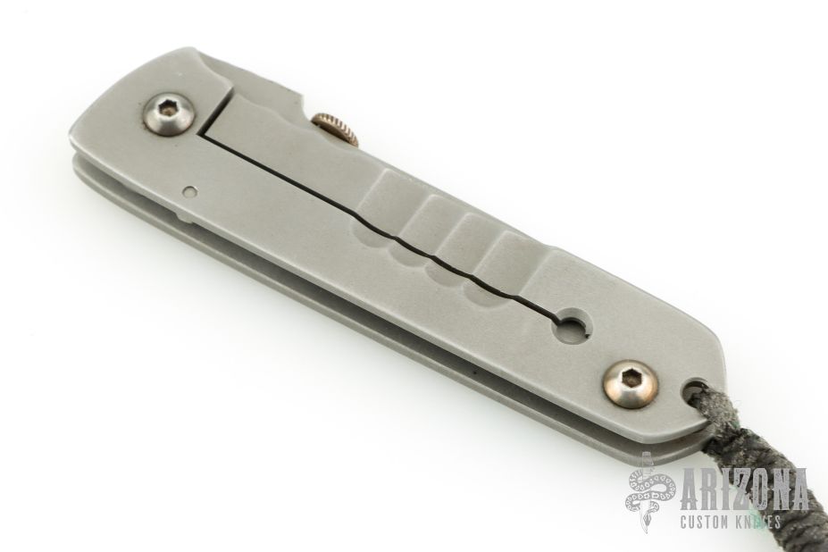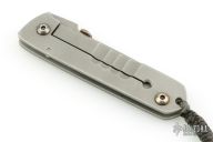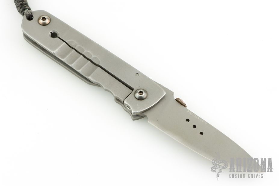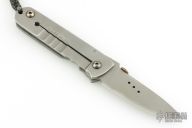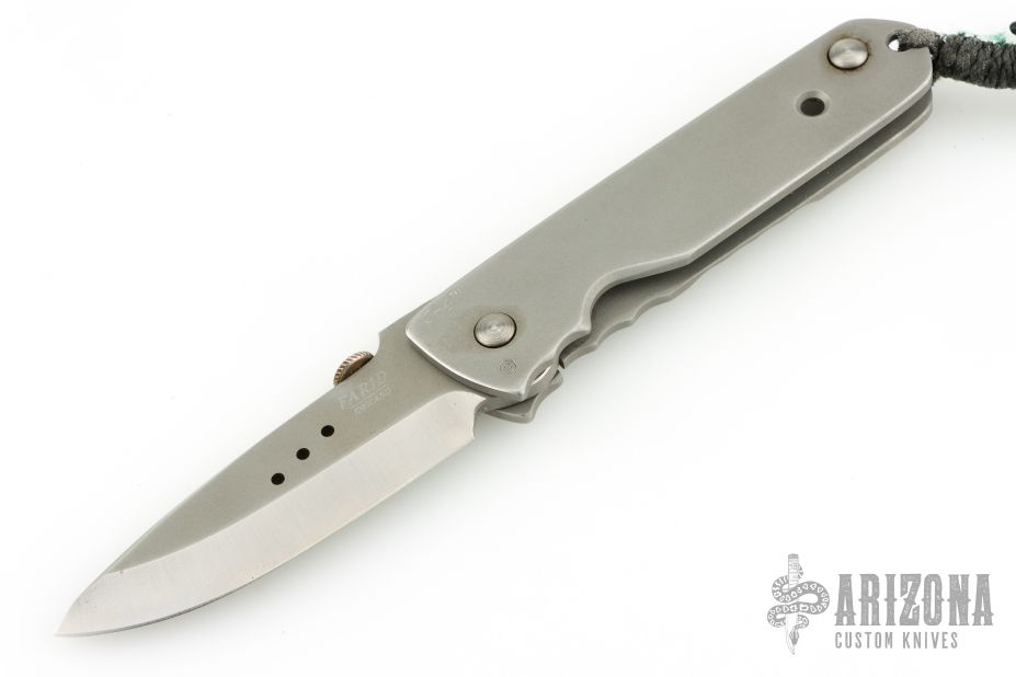 This folding knife by Farid Knives features a bead blast chisel ground blade with thumbdisc. "Moly Vanadium" blade steel. The handle has a stainless steel frame with lanyard hole. Nice detent, lockup and blade seating. Has scuffs, otherwise good condition. Comes with a leather case.