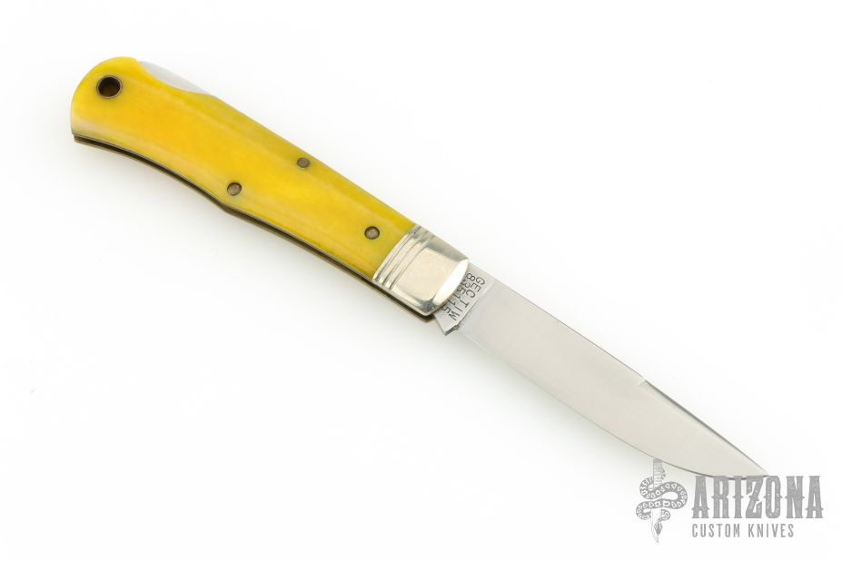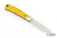 This lockback by Northfield Knives features a satin finished blade with long pull nail nick. The handle has nickel silver pinched and fluted bolsters, yellow bone covers with a nickel silver escutcheon, brass liners/pins. Comes with original tube and wax paper. Excellent condition.