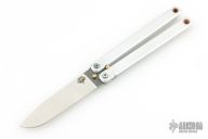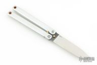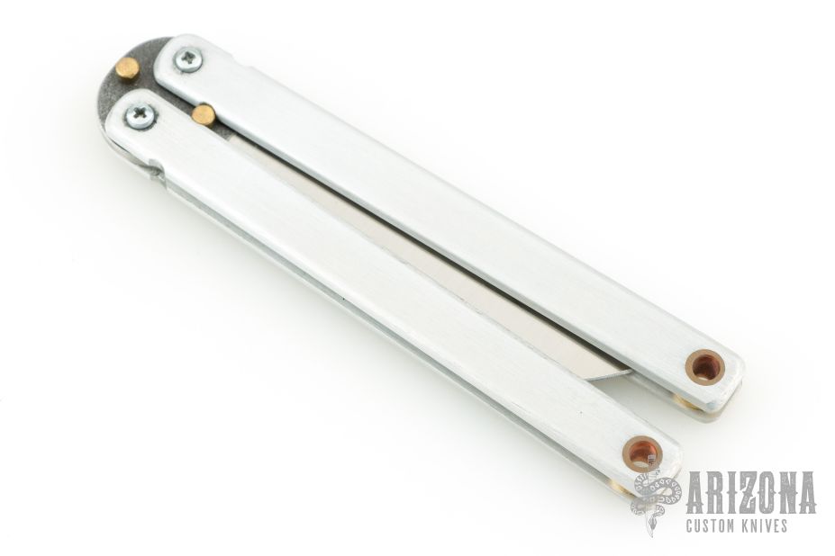 This Balisong by Atropos features a satin finished blade. The handles are satin finished aluminum with brass spacers and pins. Comes with a zippered case. Has a couple light scratches, otherwise excellent condition.