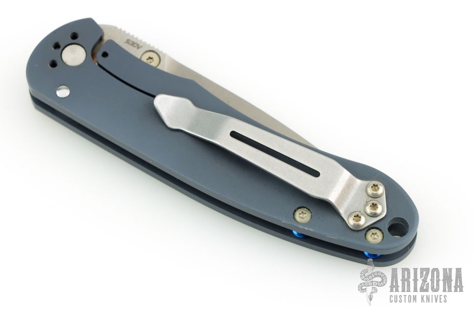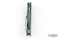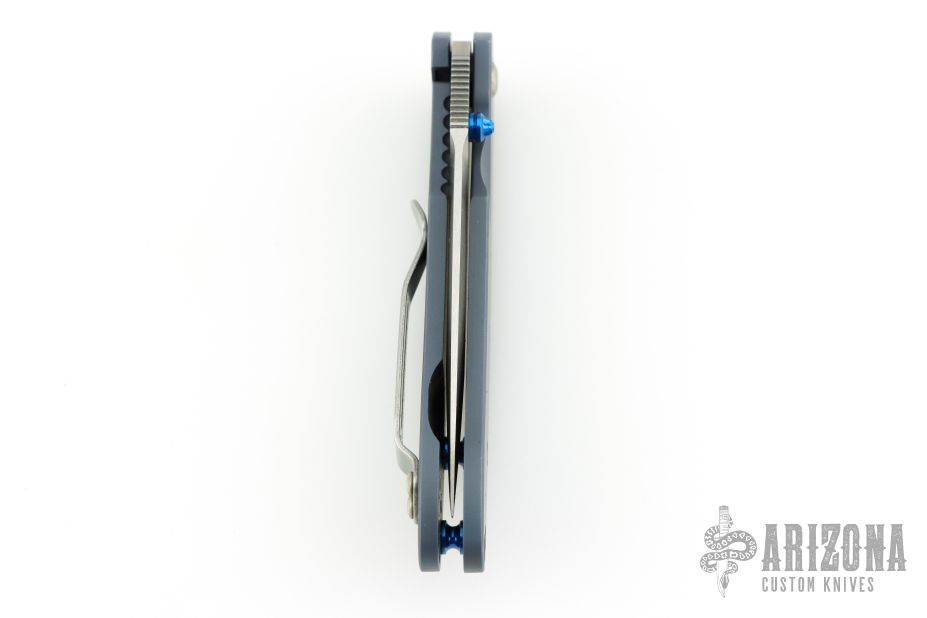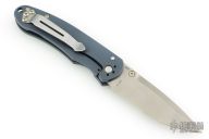 Working with Benchmade, Bradley Cutlery has produced a truly exceptional knife. From what we can tell this knife is built to last using many of the same components found in much more expensive knives. The fit and finish is beautiful. The Alias I features anodized titanium handles with blue anodized aluminum barrel spacers. Modified spear point S30V stainless blade. Monolock system (frame lock). Reversible pocket clip. Nice lockup, detent, and seating. Has a couple light scuffs, excellent condition otherwise. Comes with a zippered case