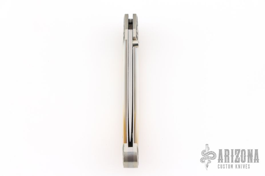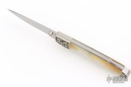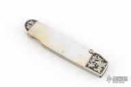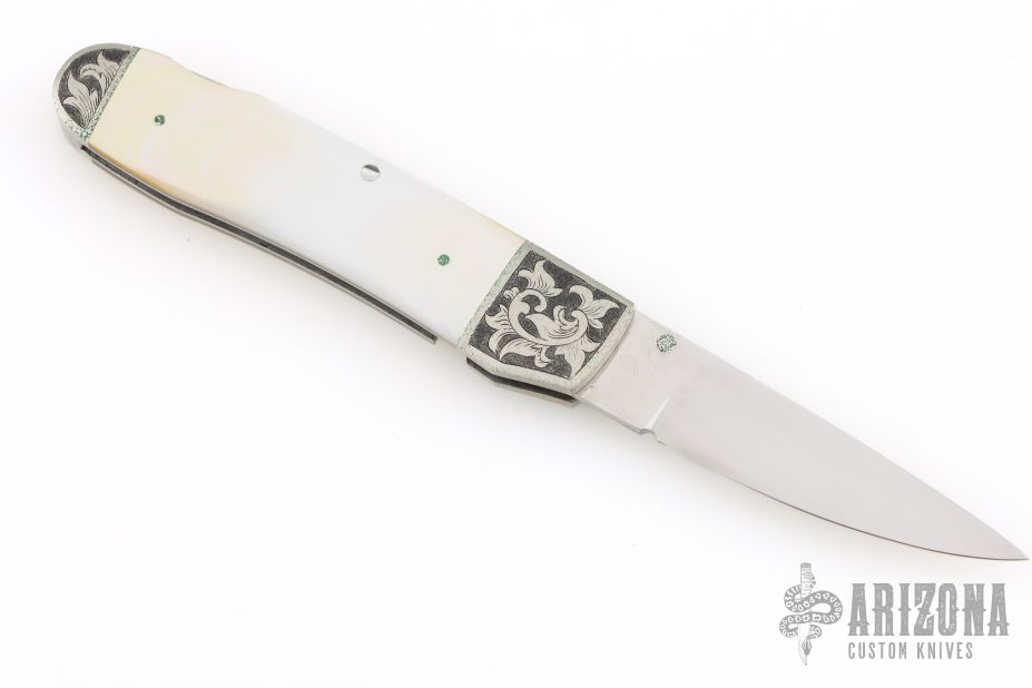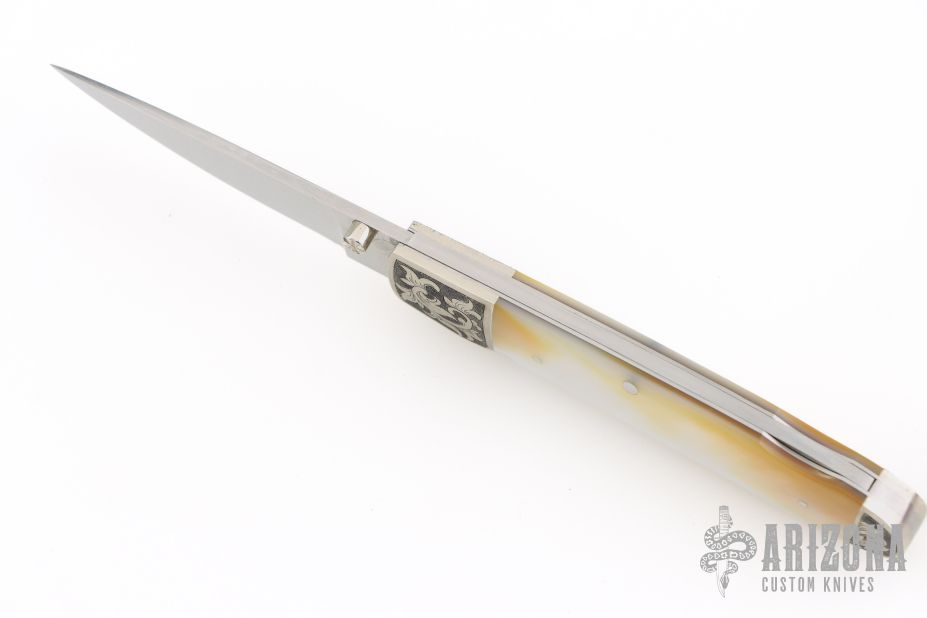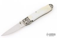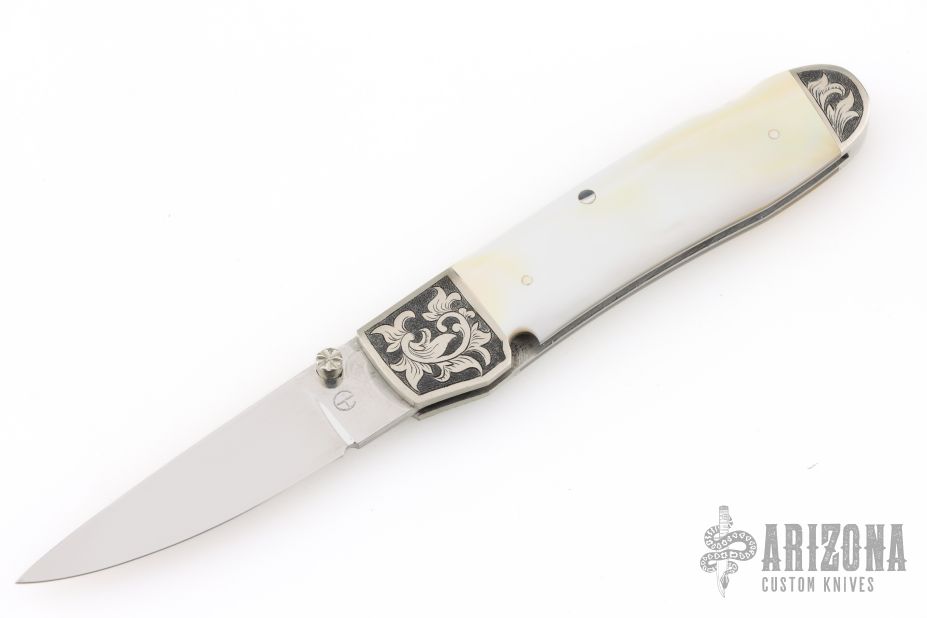 This lockback features a mirror polished drop point blade with single thumb stud. The handle has engraved nickel silver bolsters, gold lip pearl scales, stainless steel liners and backspacer. Nice lockup and blade seating. Has some light scratches, excellent condition otherwise.