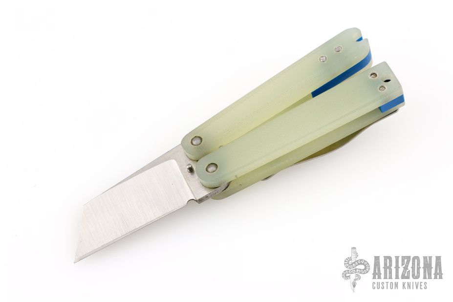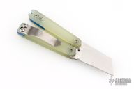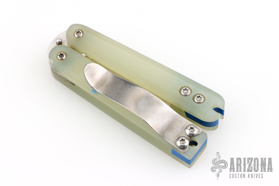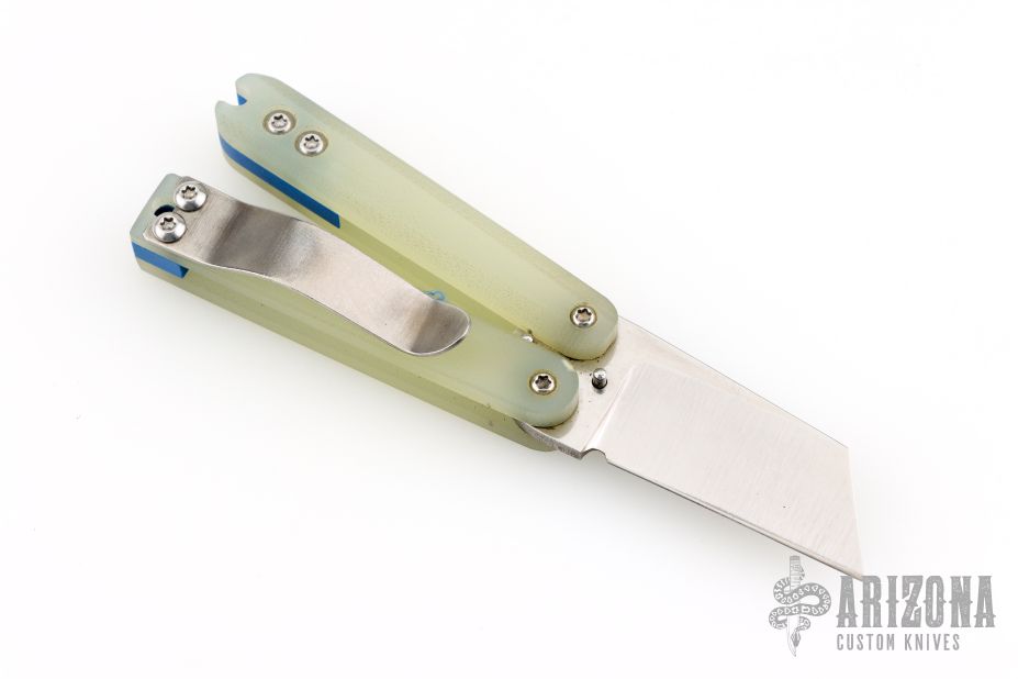 This small bali-song from Nathan Dewey features a satin finished blade. The handles are Jade G-10 with blue G-10 spacers, and a tip up titanium clip. Excellent condition. No markings on knife. Comes with hand written COA.