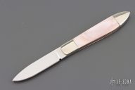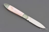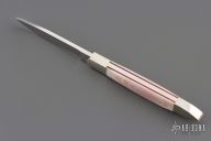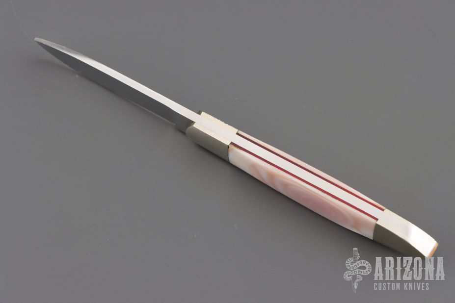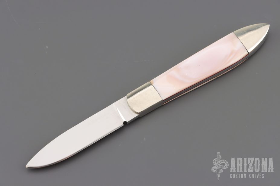 This Hunter features a mirror polished blade with .118" blade stock and .543" blade depth, full tang construction. The handle has nickel silver bolsters, pink pearl scales with red liners. Has some scratches, and patina. Excellent condition.