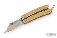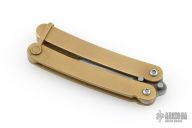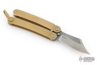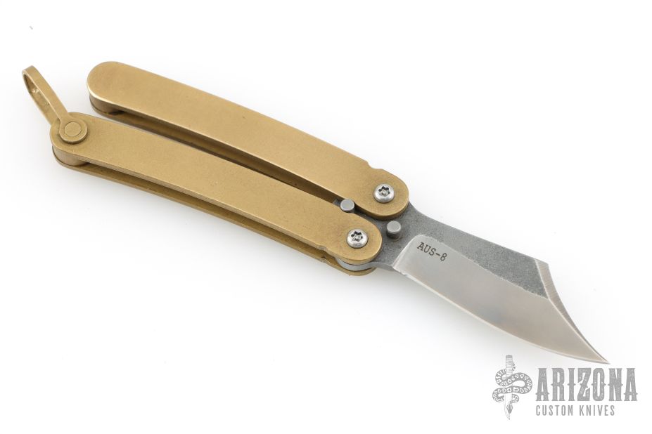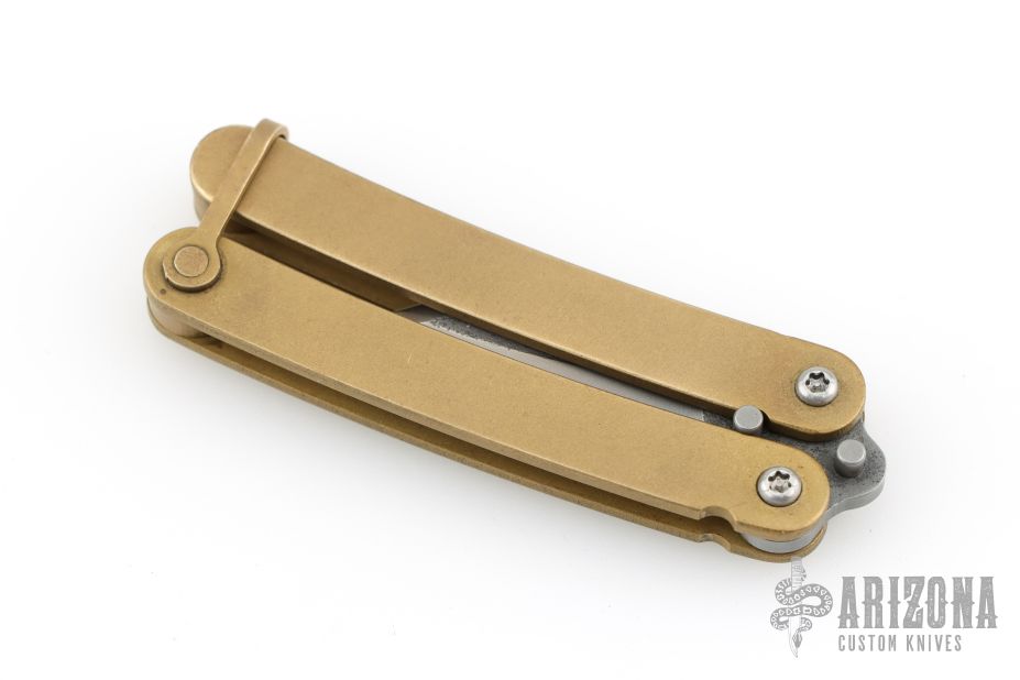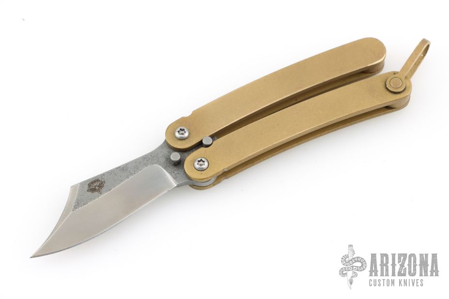 This Balisong by Atropos features a two-tone finished blade. The handles are brass with brass spacers and latch. Has a couple light scuffs, otherwise excellent condition.