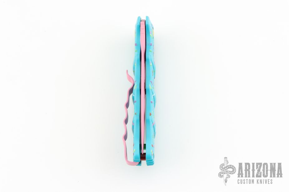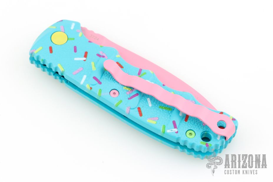 Have you ever been unfortunate enough to have to share a donut? Your plight only gets worse when you find you have to cover your high-speed, low-drag, modified, custom, mirror-edged piece of pocket jewelry in sticky sweetness. What you need is a knife designed from the ground up to go to war with a donut. And although its path to existence was unorthodox, the Dessert Warrior is here! This automatic will snap open before anyone can take more than their half of the donut. The handle is bright pink with sprinkles, and the blade has a candy blue finish, making the knife blend in with the pretty pastries of the shop. Gone are the days of not having the right tool for the job!