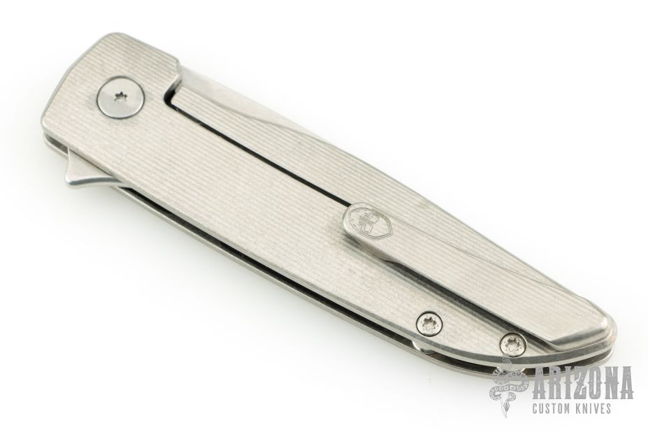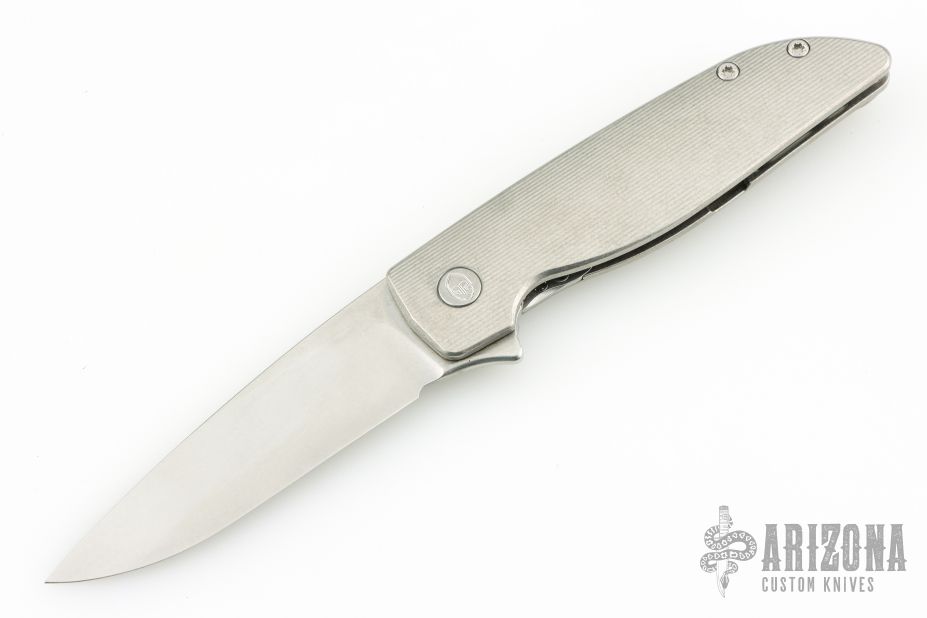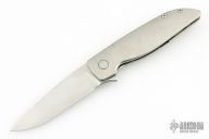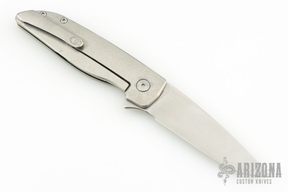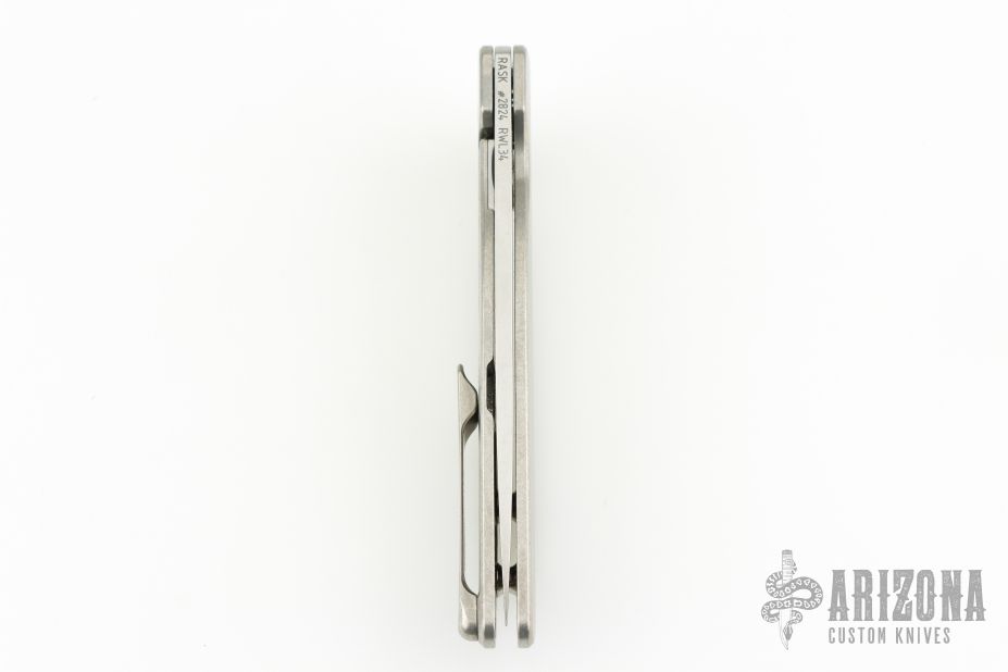 This Rask by John Grimsmo of Grimsmo Knives features a stonewash finished blade with notched flipper. The handle has a "streamline" milled and stonewashed titanium frame with matching tip up clip that has hidden screws, titanium barrel spacers and screws. Numbered #2824 on the spine of the blade. Includes original box and COA dated April 26, 2024. Excellent condition.