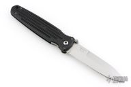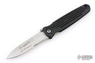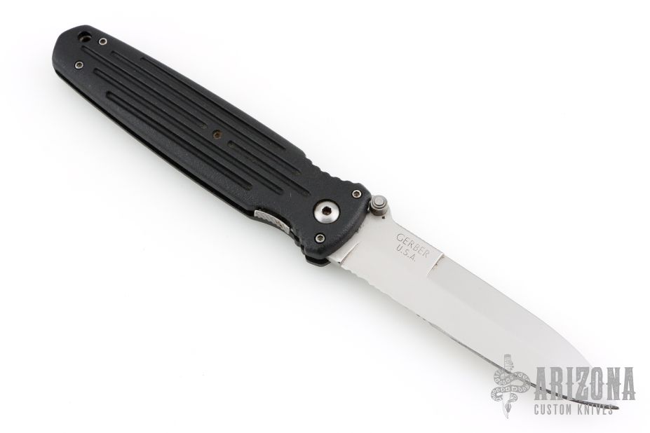 This Applegate Fairbairn Combat Folder by Gerber has a bead blasted stainless steel partially serrated spear point blade with dual thumb studs and false top edge. Handle is black contoured polymer with single stainless steel liner and lanyard hole. Comes with original sheath. Has some scuffs and scratches, great overall condition.
