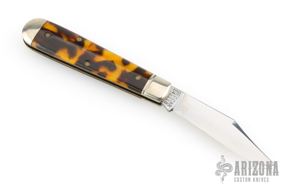 This slipjoint by Great Eastern Cutlery features a satin finished blade with nail nick. The handle has fluted nickel silver bolsters, Tortoise Shell Acrylic covers with nickel silver escutcheon, brass liners/pins, steel spring. Has half-stop.  Comes with original tube. Excellent condition. 97 made