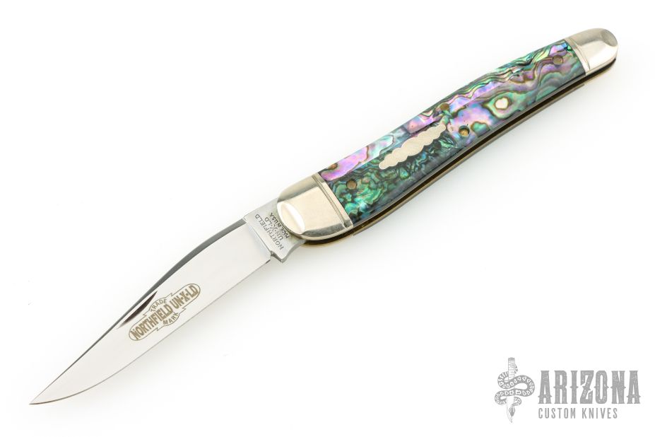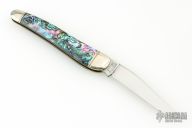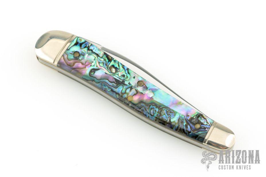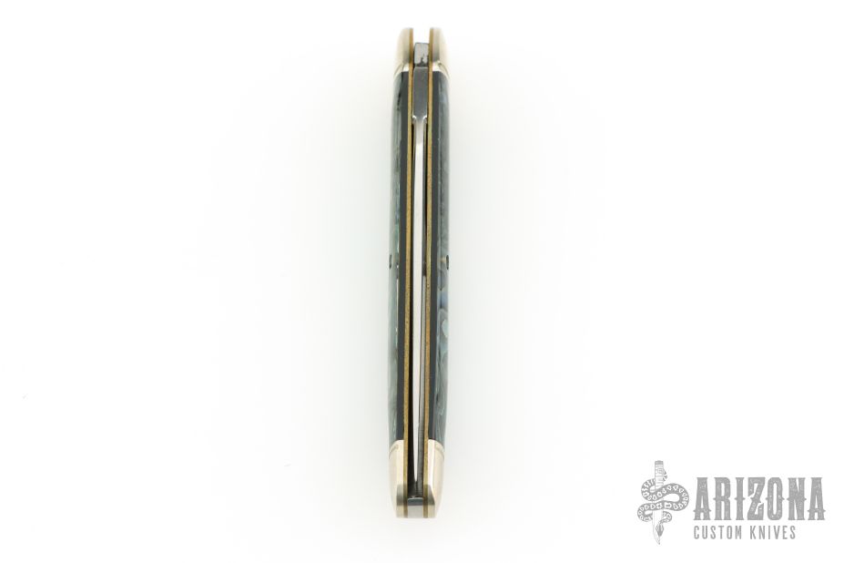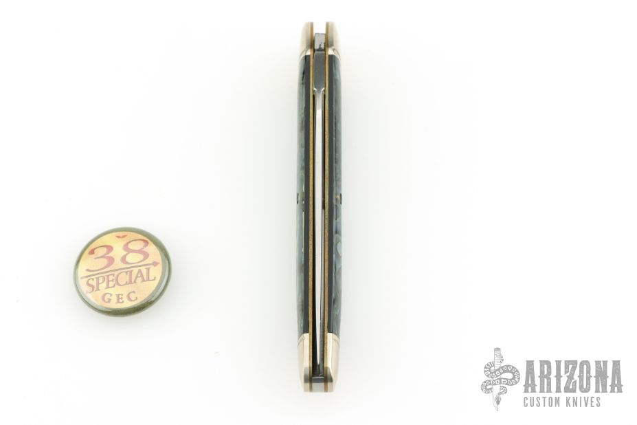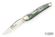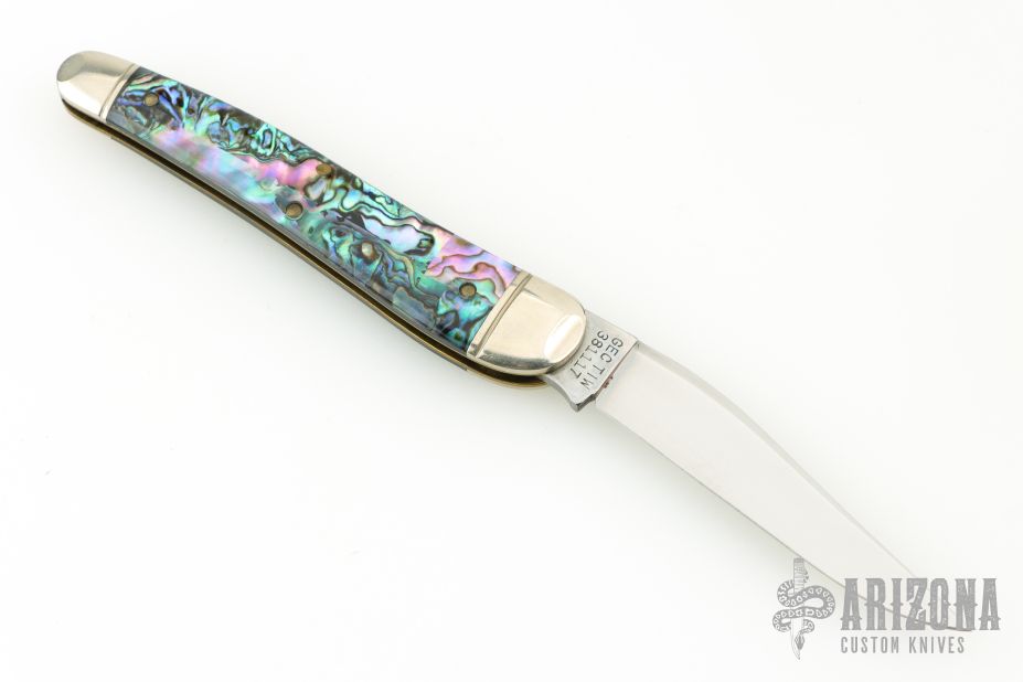 This 38 Special by Great Eastern Cutlery features a mirror finished blade with nail nick. The handle has nickel silver bolsters and brass liners, ALVS Green Abalone covers. Comes with original packaging. Excellent condition.