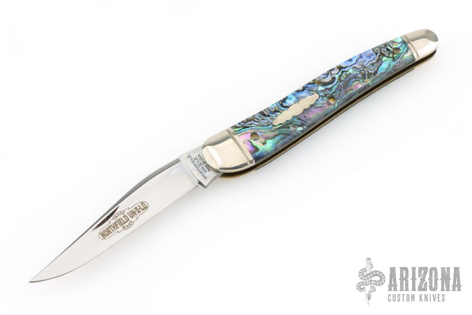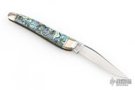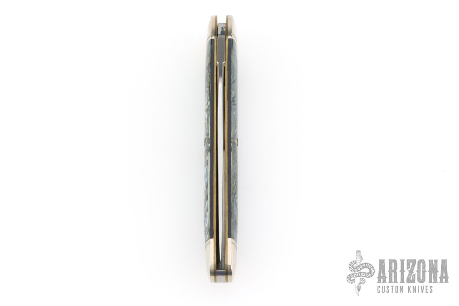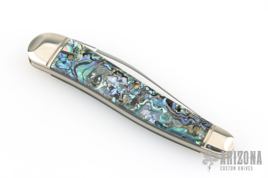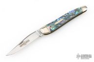 This 38 Special by Great Eastern Cutlery features a mirror finished blade with nail nick. The handle has nickel silver bolsters and brass liners, ALVS Green Abalone covers. Comes with original packaging. Excellent condition.
