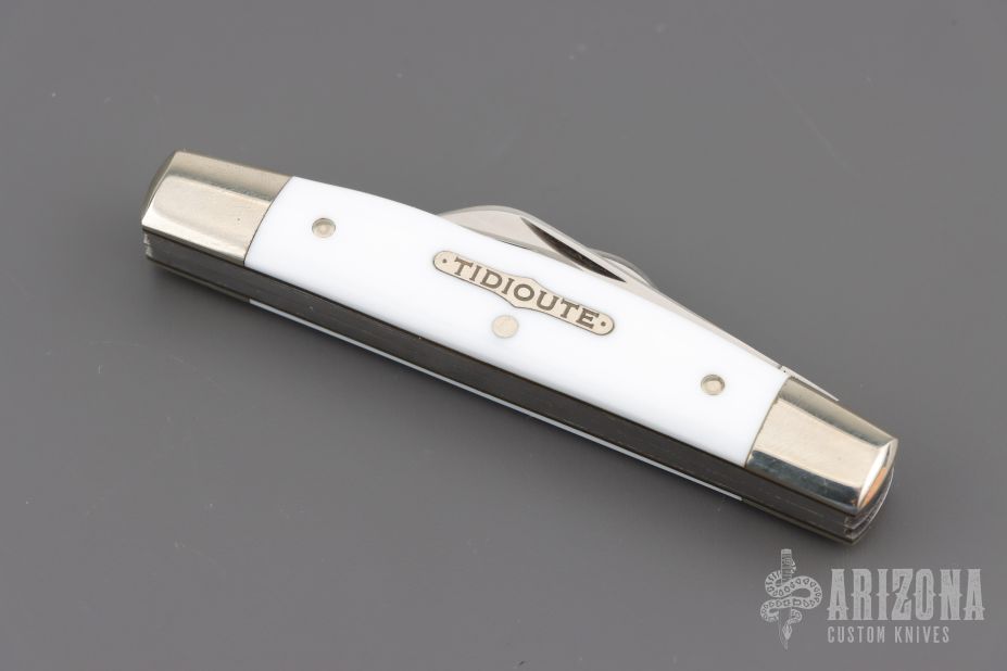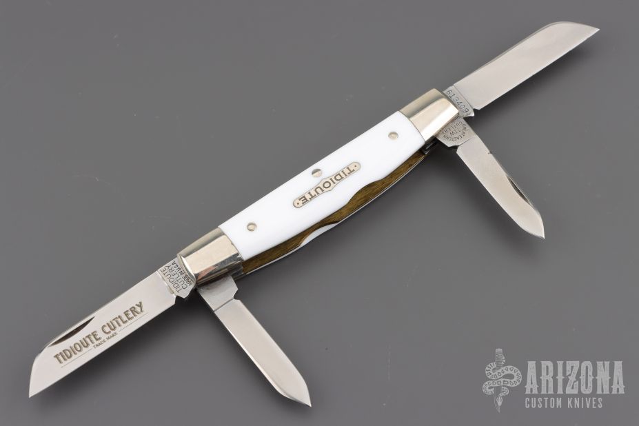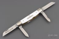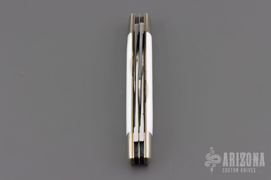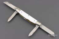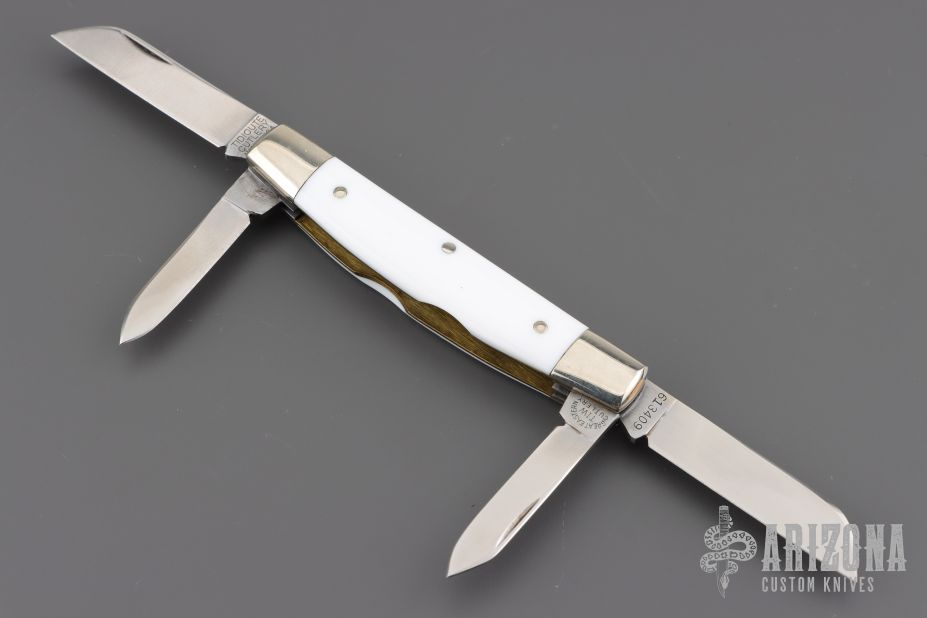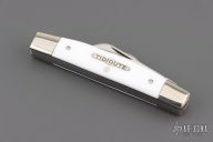 This slipjoint from Great Eastern Cutlery features four polished blades with nail nicks. The handle has nickel silver bolsters and Virgin White Acrylic covers with nickel silver escutcheon, brass liners and steel backsprings. Includes original tube. Excellent Condition.